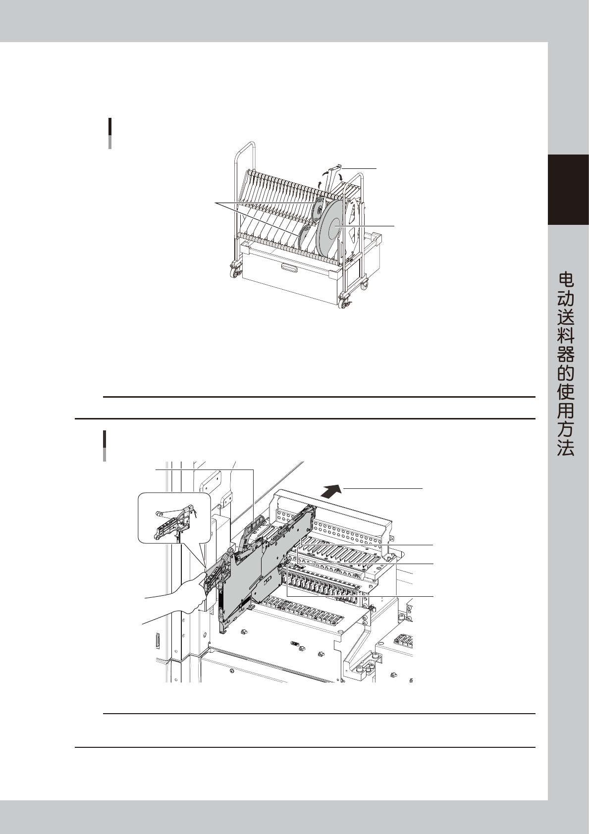 2-20 2 Z S 4. ZS 电动送料器的安装与拆卸 本节,介绍将装好了元件的 ZS 电动送料器安装在贴片机或一次性换料车上的方法。 4.1 安装在贴片机上时 下面,以 YSM10 贴片机为例介绍安装 ZS 电动送料器 ( 简称“送料器”) 的方法。 c 注意 将送料器安装在贴片机上之前,请务必先在上料台或离线上料台上装好带装元件。 不能直接在贴片机上安装带装元件。 e 1 打开贴片机的安全机盖。 按急停按钮之后,打开贴片机…