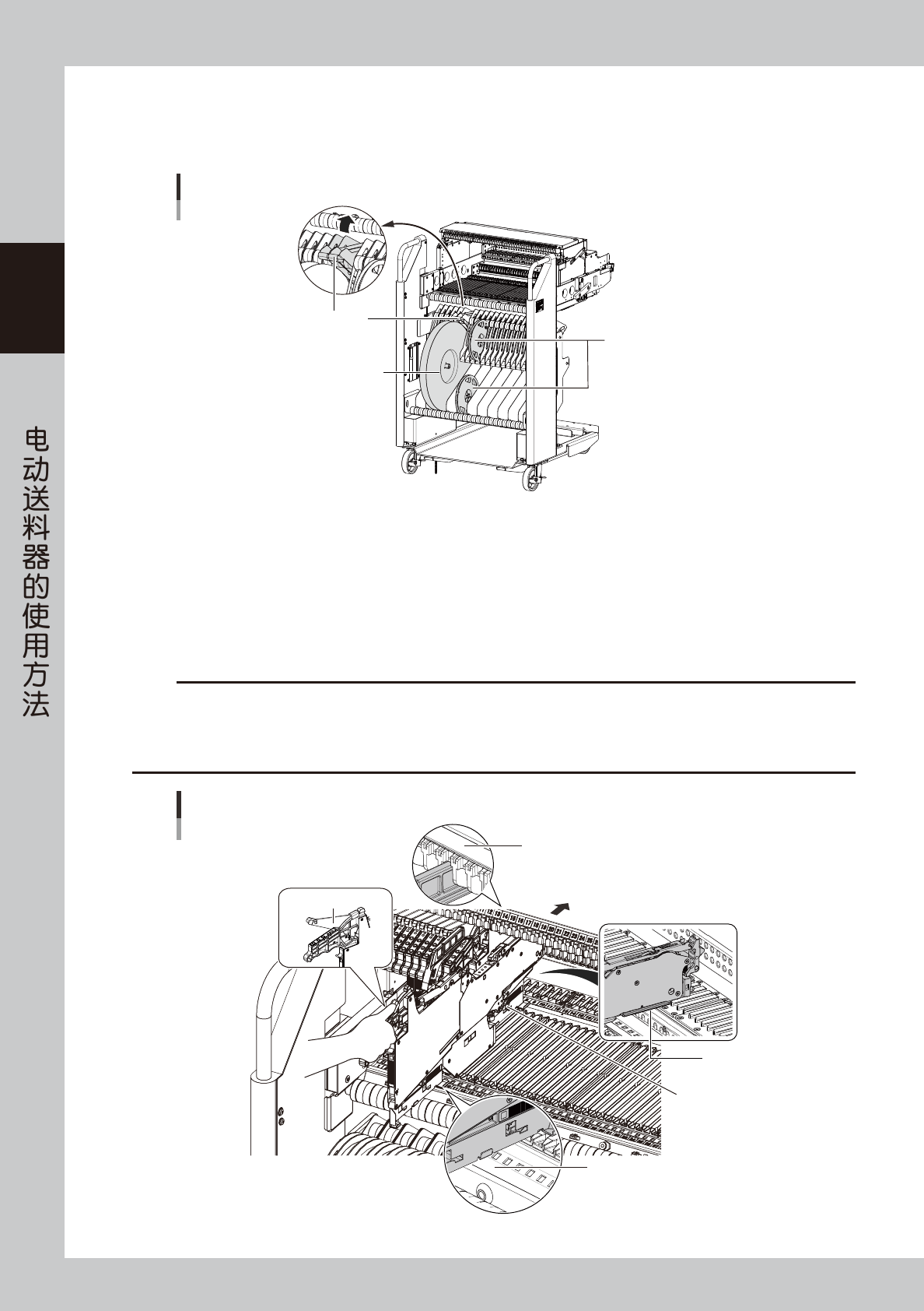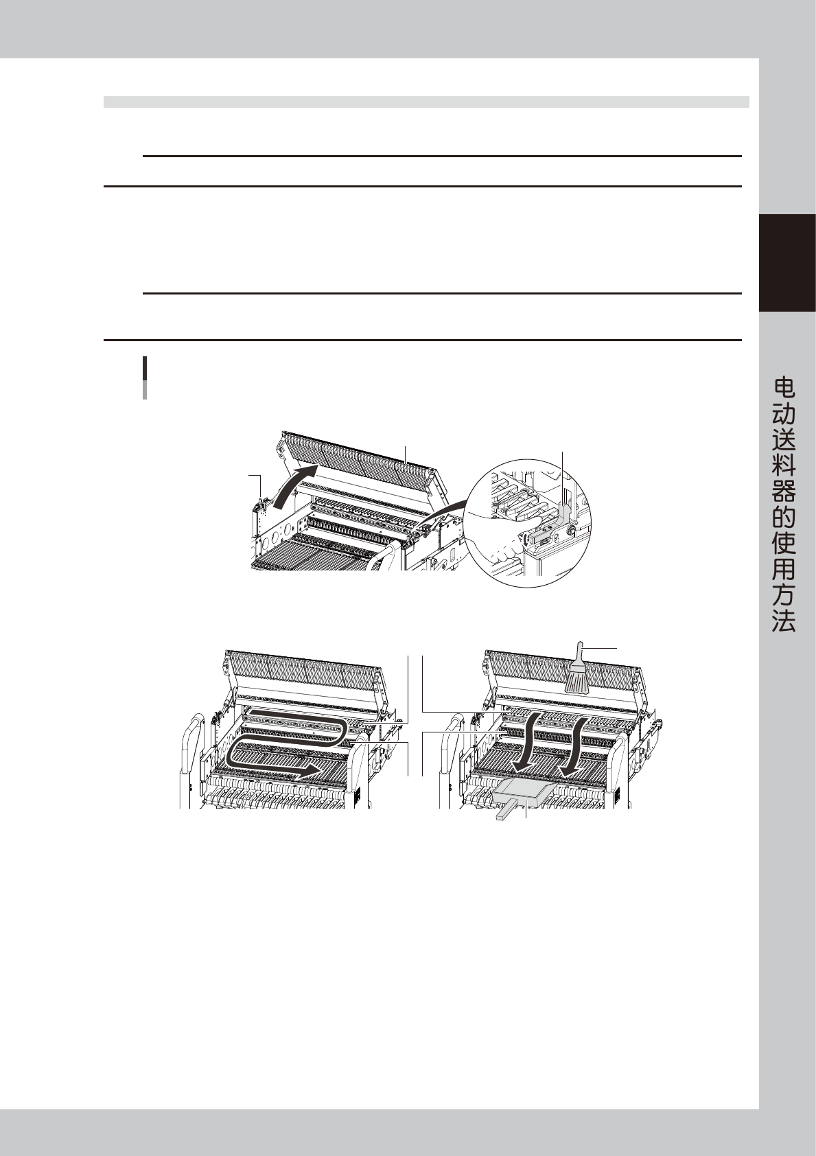 2-23 2 Z S 4.2 安装在一次性换料车上时 在此,以 YSM40R 用一次性换料车 ( 简称“料车”) 为例介绍安装 ZS 电动送料器 ( 简称“送料器”) 的方法。 c 注意 将送料器安装在一次性换料车上之前,原则上需先在上料台或离线上料台上装好带装元件。 1 清洁送料器架。 1. 按料车左右的锁杆,打开导槽盖板。 2. 使用软刷 ( 随机附带 )、家用吸尘器或吸尘工具 ( 选配 ) 清除送料器架上的尘屑。 c 注意 …