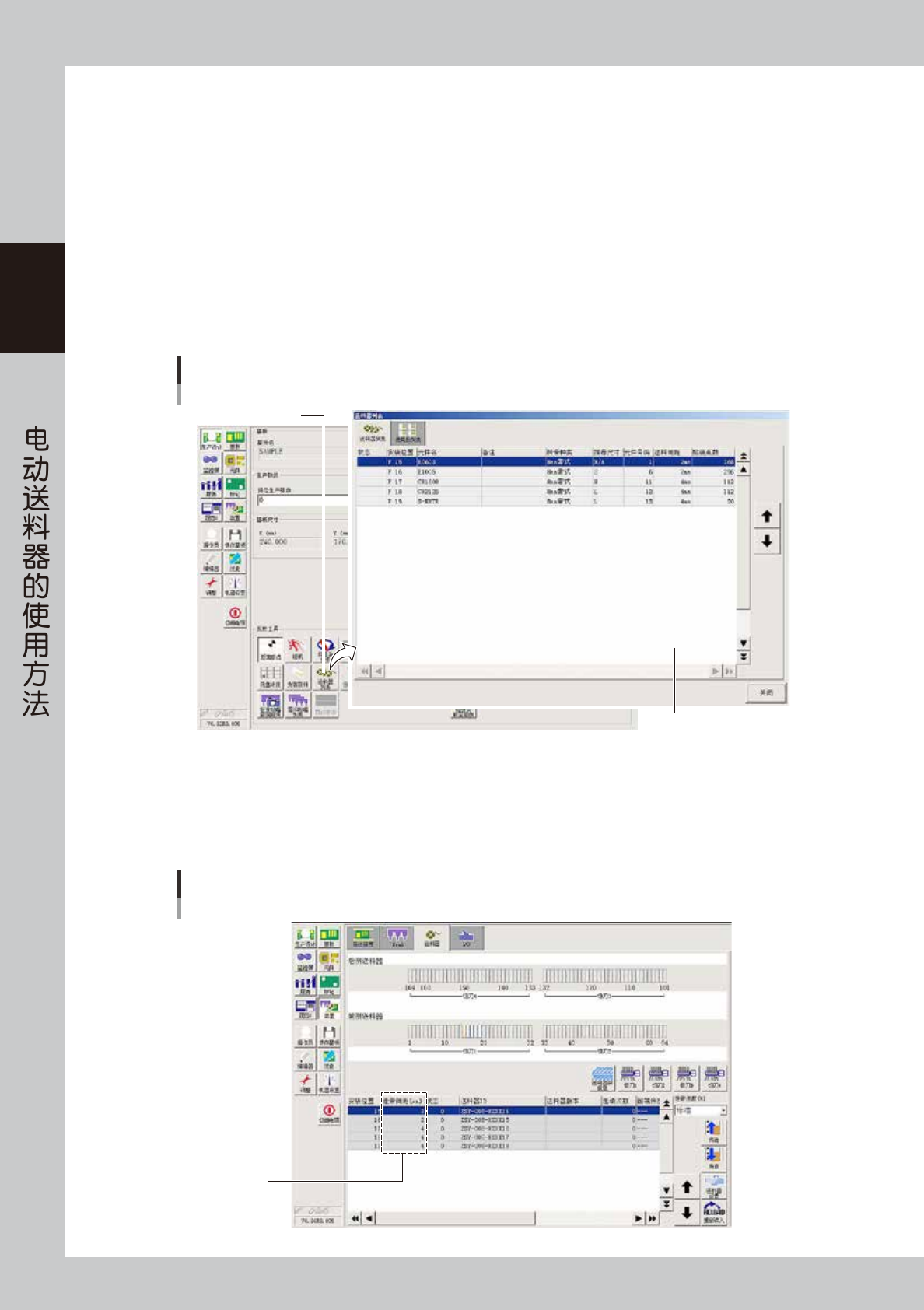 2-32 2 Z S 5.2.2 在贴片机的“装置”画面中设定 下面,介绍在“装置”画面设定走带间距的方法。要使用该方法,需将 [ 机器设置 ] -“机器信息”-“选项设置” 画面的“指定送料器的走带间距”参数设定为“在送料器中设置” 。 1 确认带装元件的送料间距。 在设定之前先确认带装元件的送料间距。 2 将送料器安装在贴片机的送料器架上。 1. 按“生产设计”画面的 [ 选择基板 ] 按钮,读入基板程序。 2. 按“生产设计”画…