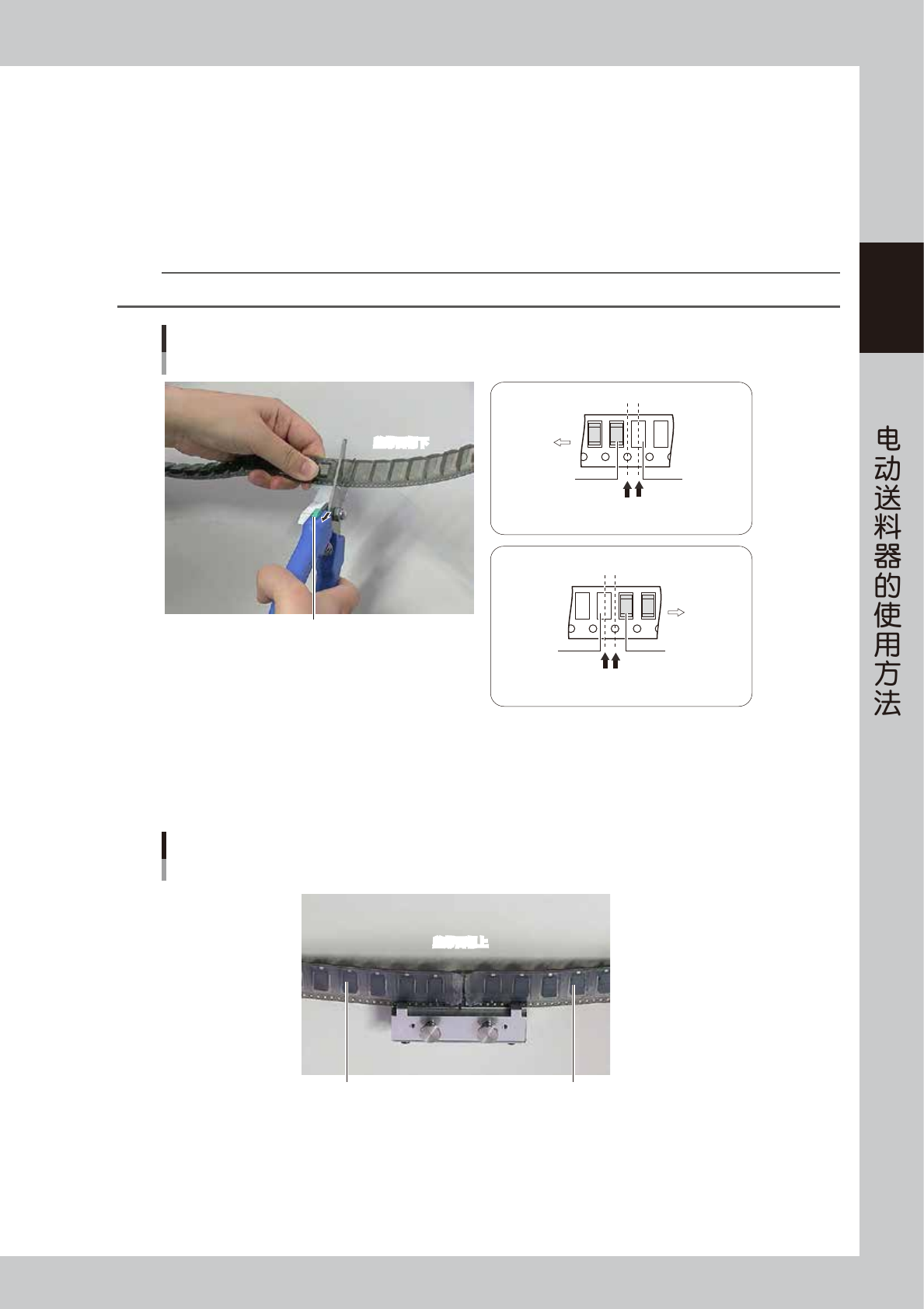 2-44 2 Z S 3 用拼接胶带拼接使用中的料带末端与补充用料带的前端。 1. 将拼接胶带 (24mm 宽料带用 ) 沿中央部的剪切线分离,并剥离有走带孔的拼接胶带侧的厚衬纸。 2. 将拼接胶带长方向的中央对准夹具细槽并将走带孔套在夹具的定位针上之后,将拼接胶带粘贴在料带 的盖带侧。 3. 按夹具的两个按钮,将已拼接在一起的料带从夹具中取出。 4. 将在 1. 中分离的无走带孔的拼接胶带的厚衬纸剥离之后,粘贴在载带侧。 5. 剥离盖…