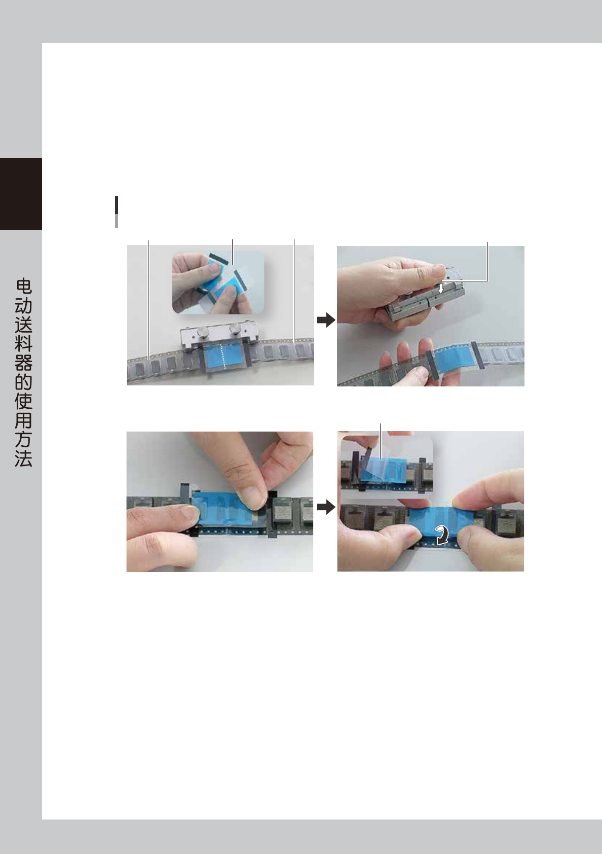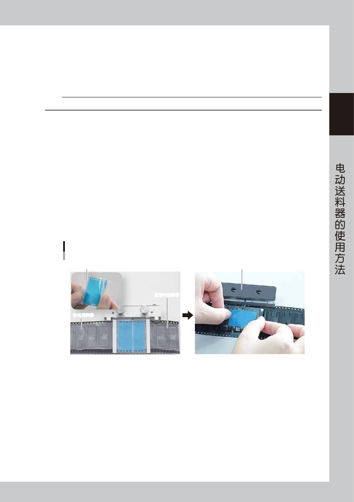 参照本章前述“7.2.1 8mm 宽的料带时”的 Step2、3 的步骤,如下图所示,将盖带面朝上将使用中的