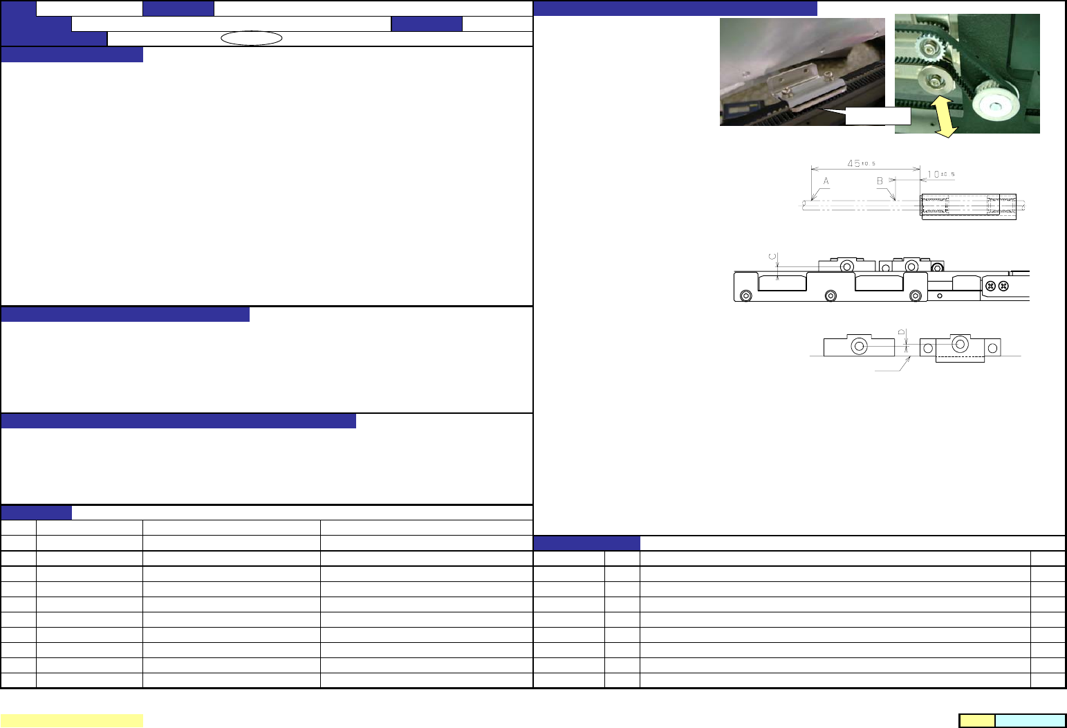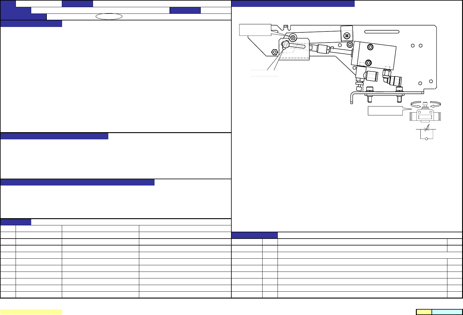 机 种 1.速度控制 调整时,线全部拧仅螺丝,返回指定转动 。 调整 后用螺母固定。 1.速度控制打 开度 :A 侧 ( 安装在气缸)从 全闭 打 开 1 圈。 :B 侧 从全 闭 打 开 2.5圈。 2.止 动 板的 动作应顺畅 。 2.ON/OFF空气, 观察 止 动 板的 动作 。 止 动板的支点部的粘合剂出来,说明润滑脂不足 。 请 注意止 动销插到导向器长孔的情况 。 1. 让 基板止 动 器以适当的速度 动作 。 2. 维持…