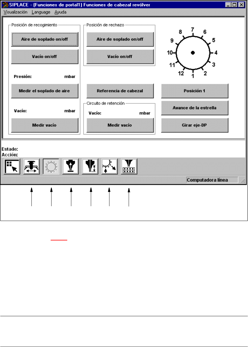 Instrucciones de ser vicio SIPLACE S -23 HM 5 Funciones individuales Versión de s oftware SR.406.xx Edición 02/00 ES 5.2 Funciones individuales portal 153 5 Fig. 5.2 - 1 Visualización "Funciones de cabezal revólver&…