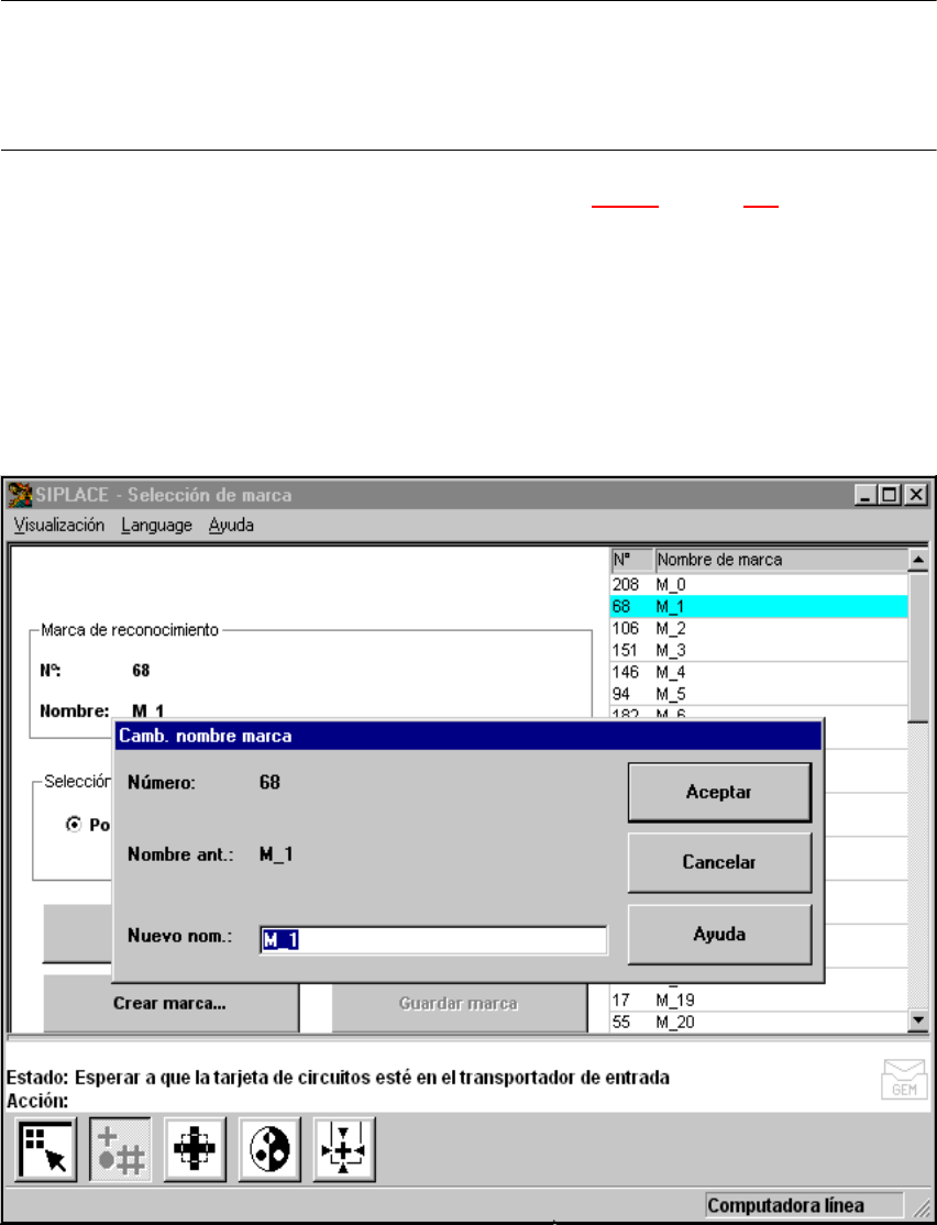 Instrucciones de servicio SIPLACE S-23 HM 6 Funciones ópticas Versión de software SR.406.xx Edición 02/00 ES 6.5 Determinar los parámetros de la marca 213 6.5.3.4 Opción "Generar marca" Con esta opción puede ge…
