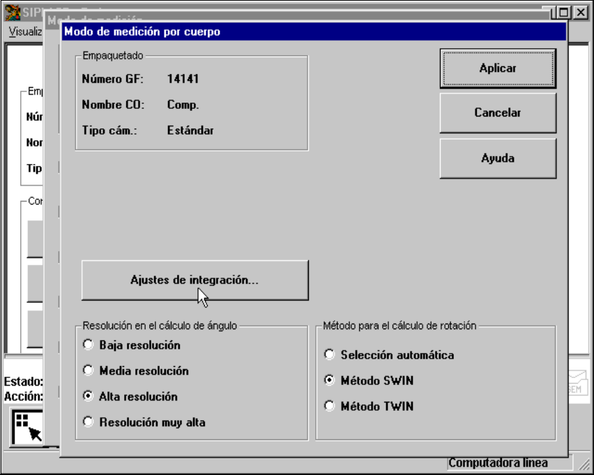 Si ha hecho clic en el botón "Ajustes de integración" se visualiza el menú "Modo de medición por