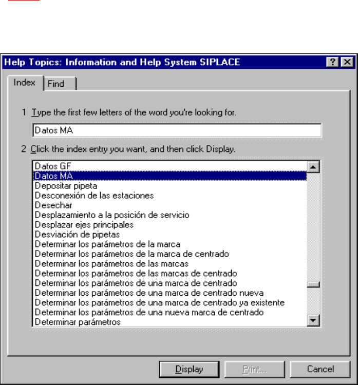Instrucciones de ser vicio SIPLACE S -23 HM 9 Sistema de ayuda online Versión de s oftware SR.406.xx Edición 02/00 ES 9.1 Generalidades 359 9.1.2 Funciones de la vent ana princip a l del sistema de ayuda 9.1.2.1 Imprimir…