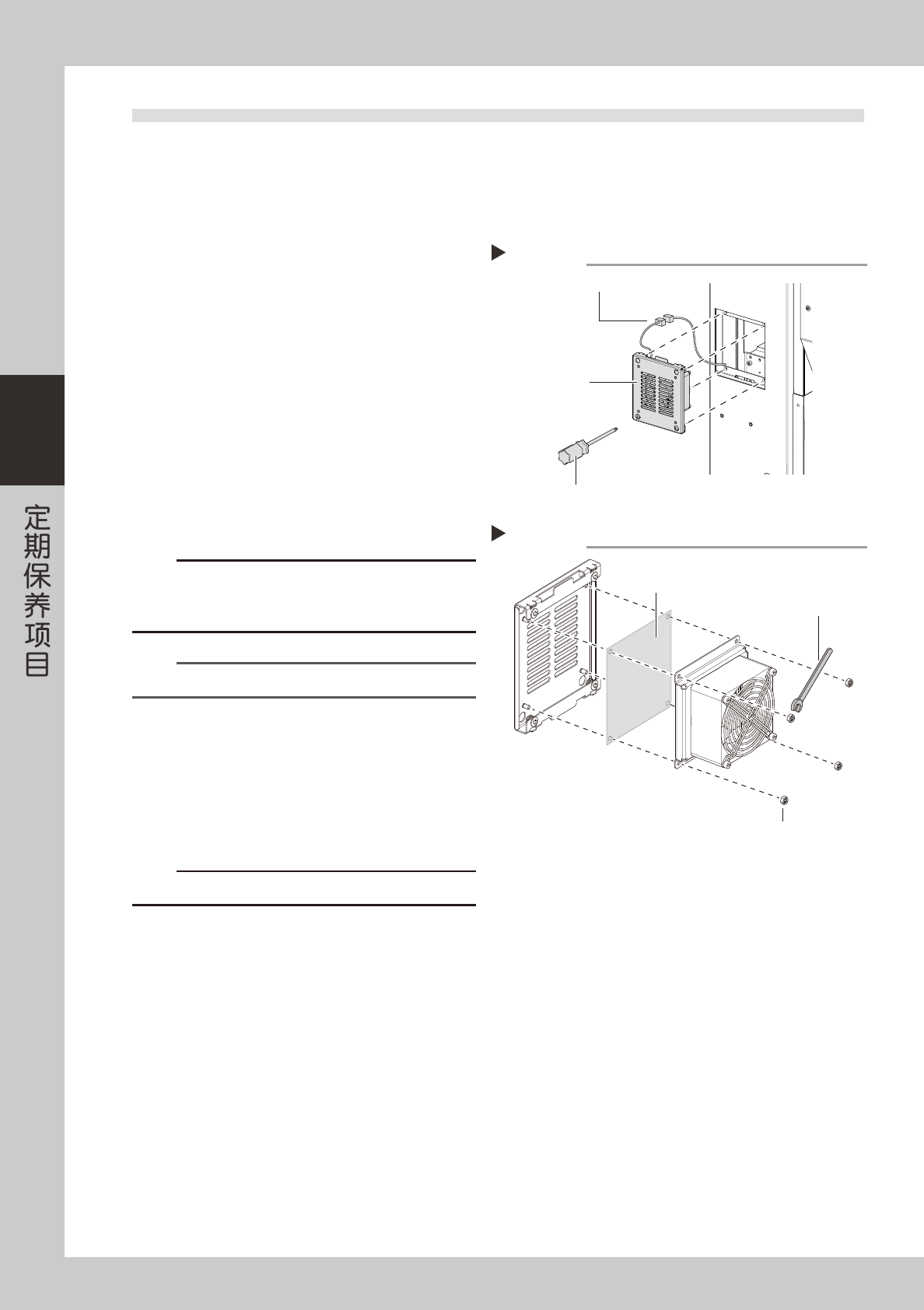 3-20 3 3.3 贴片机正面吸气扇过滤网的清洁 为散发轴运行时产生的热量,本机正面左右各装有 1 处吸气扇。若对吸气扇的过滤网不进行定期清洁,会导致网 眼被堵塞,引起贴片机内部的温度上升。这将导致设备性能下降并缩短使用寿命。因此,请务必定期清洁各个过 滤网。为拆卸吸气扇清洁过滤网,请务必先关闭贴片机的电源。 1 关闭贴片机的电源。 2 拆卸吸气扇。 1. 用十字螺丝刀拆卸 4 处固定螺丝之后,拆下吸 气扇。 2. 拔掉吸气扇的电源线…
