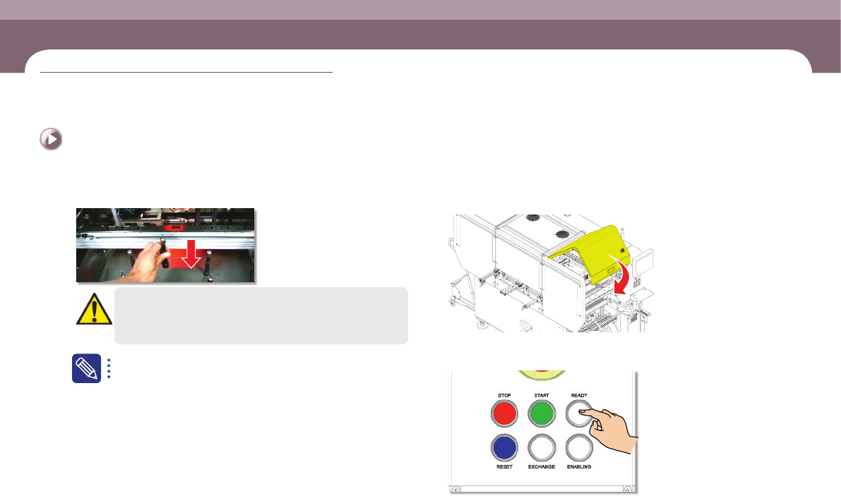HM520 Ope rati on Handbook 3-1 6 第 3 章 本 Chapter 主要介绍生产作业顺序。 生产 C utting-edge Modular Mounter 准备生产 Ⅱ > 安装 顶块 (Ba cku p Pin ) 准备生产※Ⅱ 生产 6. ※ 安 装顶块 (B ackup Pin) Step 1. 在 MMI 实行 Gantr y Park ing 。 Step 2. 打 开正 / 背 面的 安…
