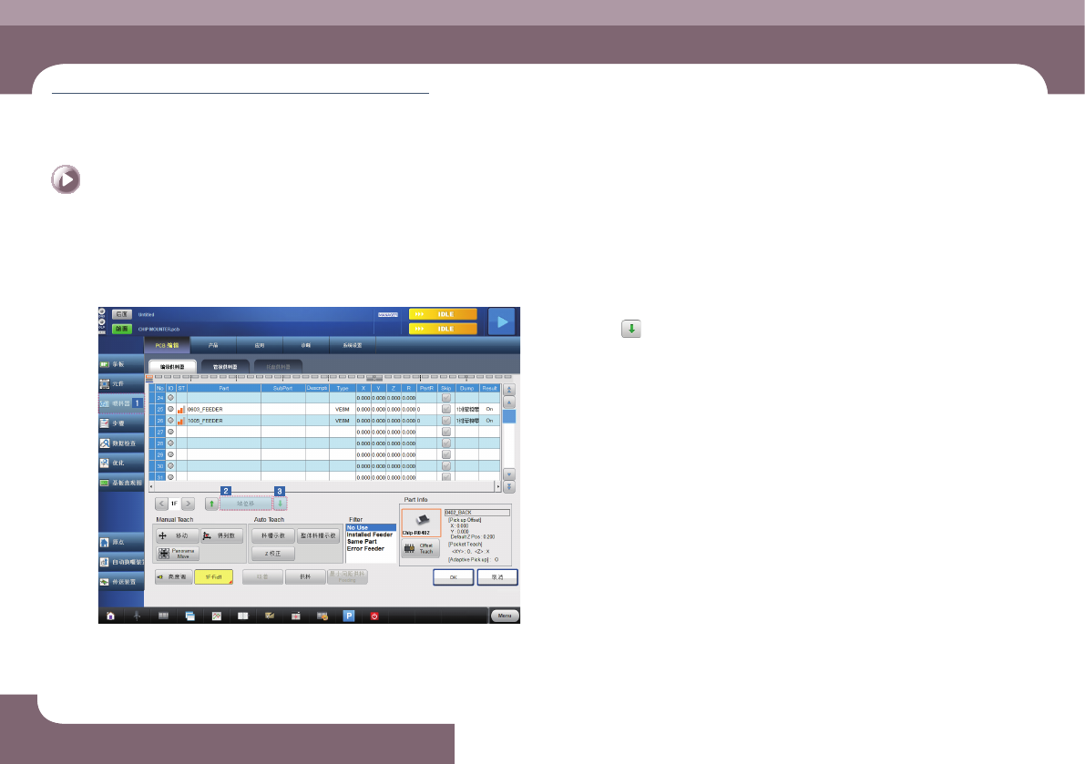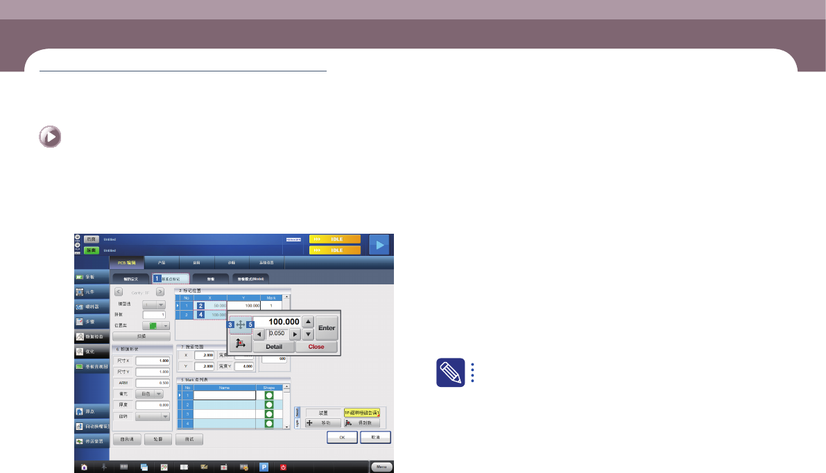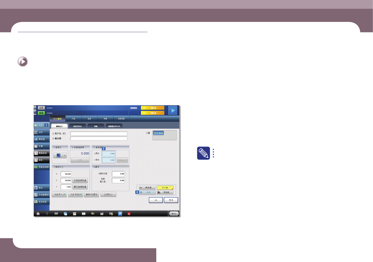 HM520 Ope rati on Handbook 3-1 9 第 3 章 本 Chapter 主要介绍生产作业顺序。 生产 C utting-edge Modular Mounter 准备生产 Ⅱ > 检查位置及示教 准备生产※Ⅱ 2. 检查 P CB 基 准 标 记位 置 Step 1. 检 查 当前设 定的 P CB 基 准 标 记 位 置。 1 2 4 5 3 ① 单击<基准符号>键。 ② 在 <2. …