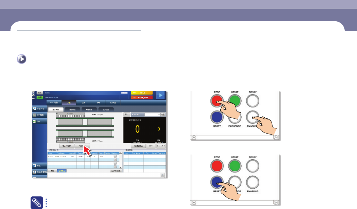 ㆍ 单击<PCB停止>键时,将在投入当前工作站的PCB生产完毕后停止生产,设备则进