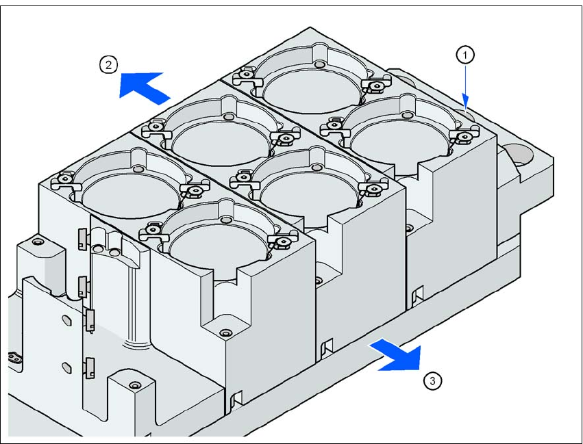 Align the nozzle changer so that the marking hole (item 1) is on the left, as viewed by the op-