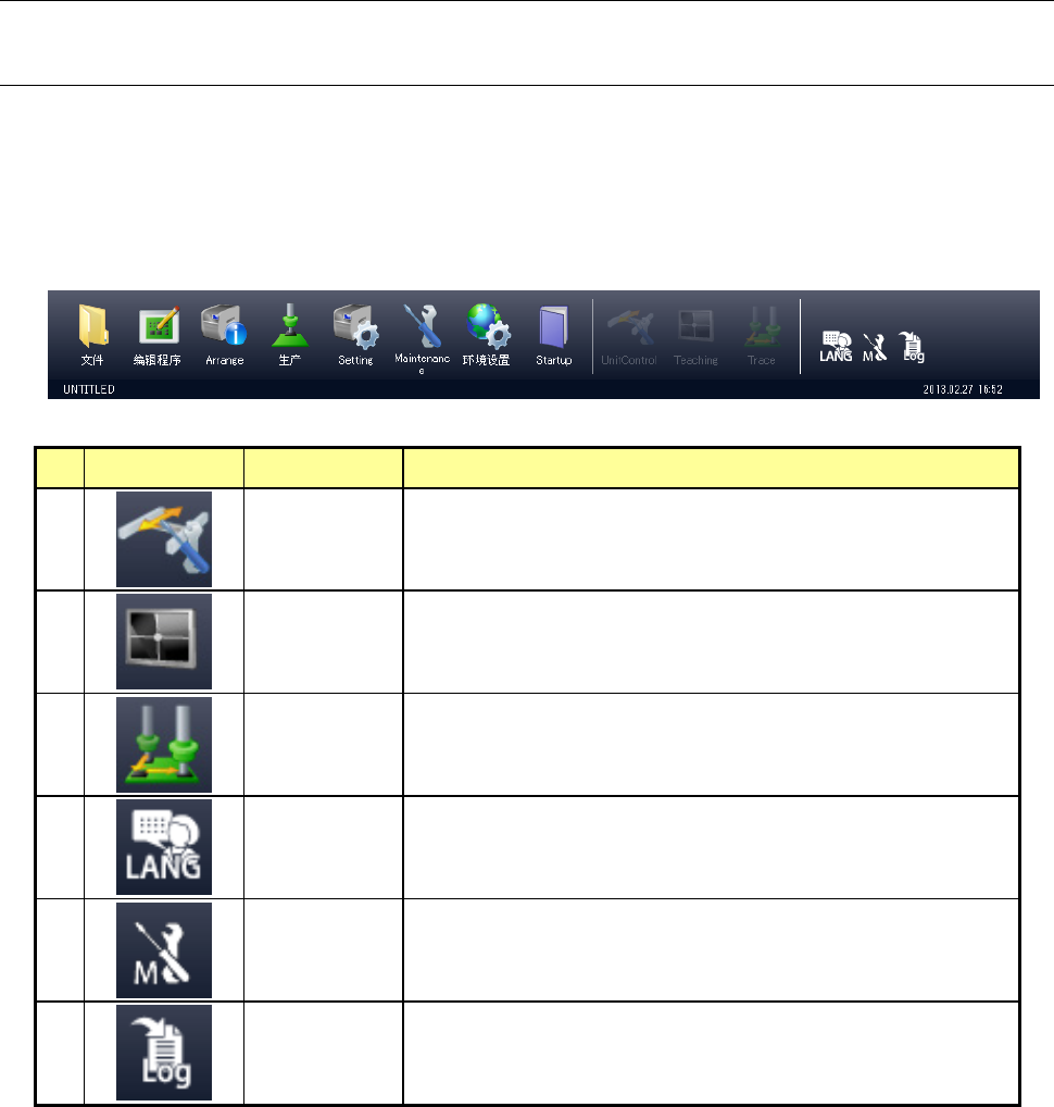 操作手册 1- 14 1-4- 4 菜单、功能按钮 本机的操作画面上的可通过菜单、以及功能按钮进行操作。 1-4-4- 1 功能按钮的构成 RS-1 在操作区域及信息区域除了菜单以外,还配置有功能按钮。 (1) 操作区域的功能按钮 操作区域的功能按钮配置在以下位置。 任何按钮都有可能无法通过起动中的应用程序选择。 No. 图标 名称 概要 1 简易控制 从当前起动的应用程序可运行简易控制时,进入简易控制运 行。 2 示教 从当前起动的应…