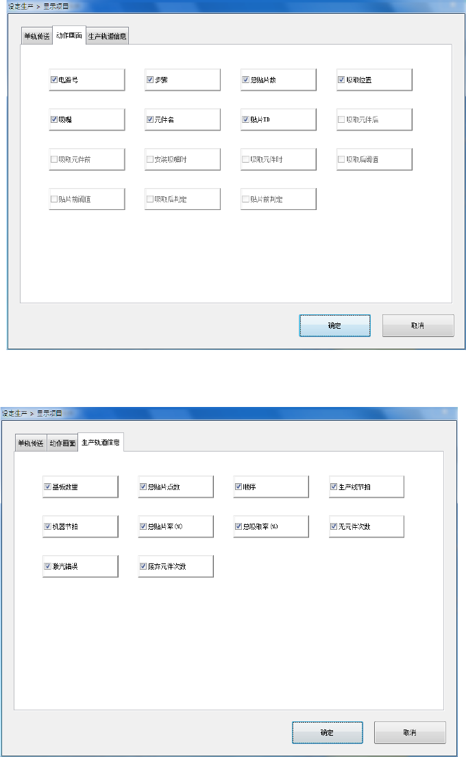 操作手册 2- 43 可在「动作画面」选项卡中设置动作状态画面的 H ead 信息项目的显示 / 隐藏。 可在「生产轨道信息」选项卡中,设置图像 / 动作状态 / 生产数量画面上部的生产轨道信息的显示 / 隐藏。