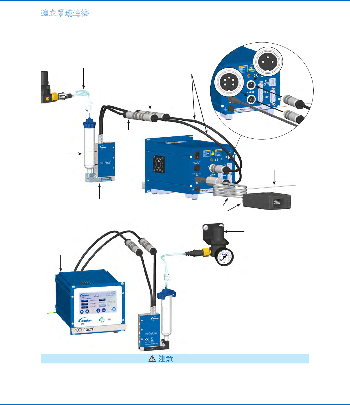这些系统安装示例为PICO Pμlse胶阀及Toμch控制器系统的安装提供了具有代表性的示范。请参见Toμch控制