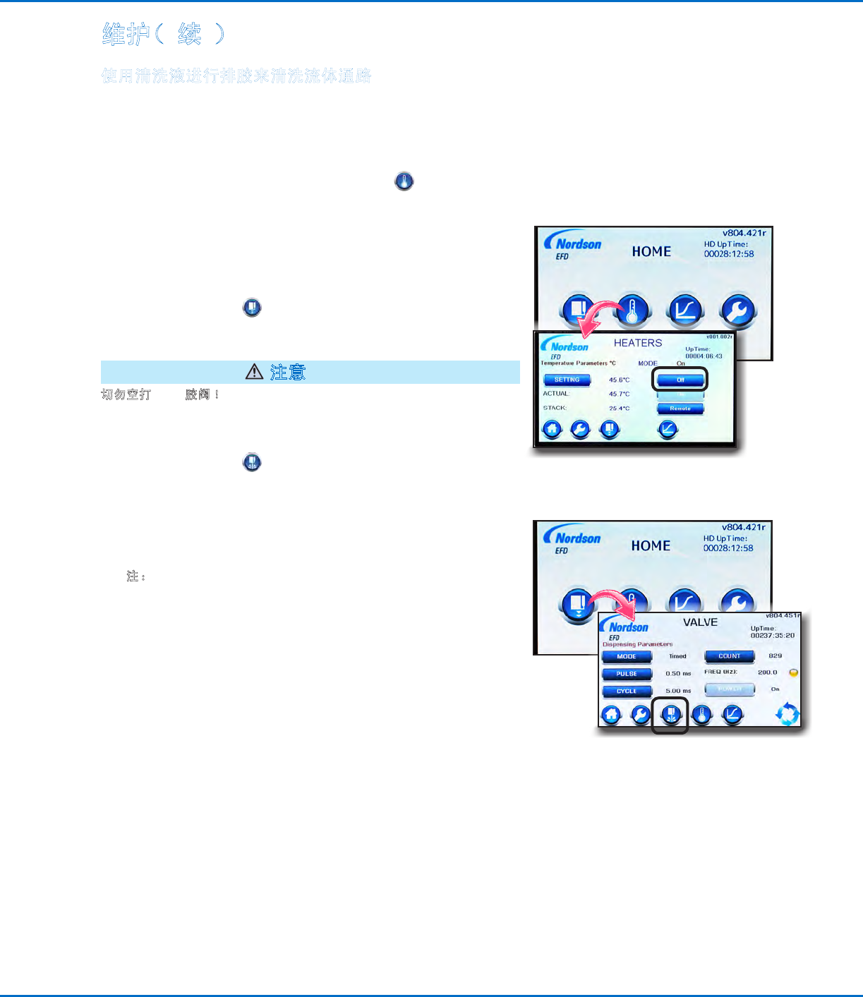 6. 按住“排胶”图标 ( ) 直至流出的流体干净清洁,然后松开“排