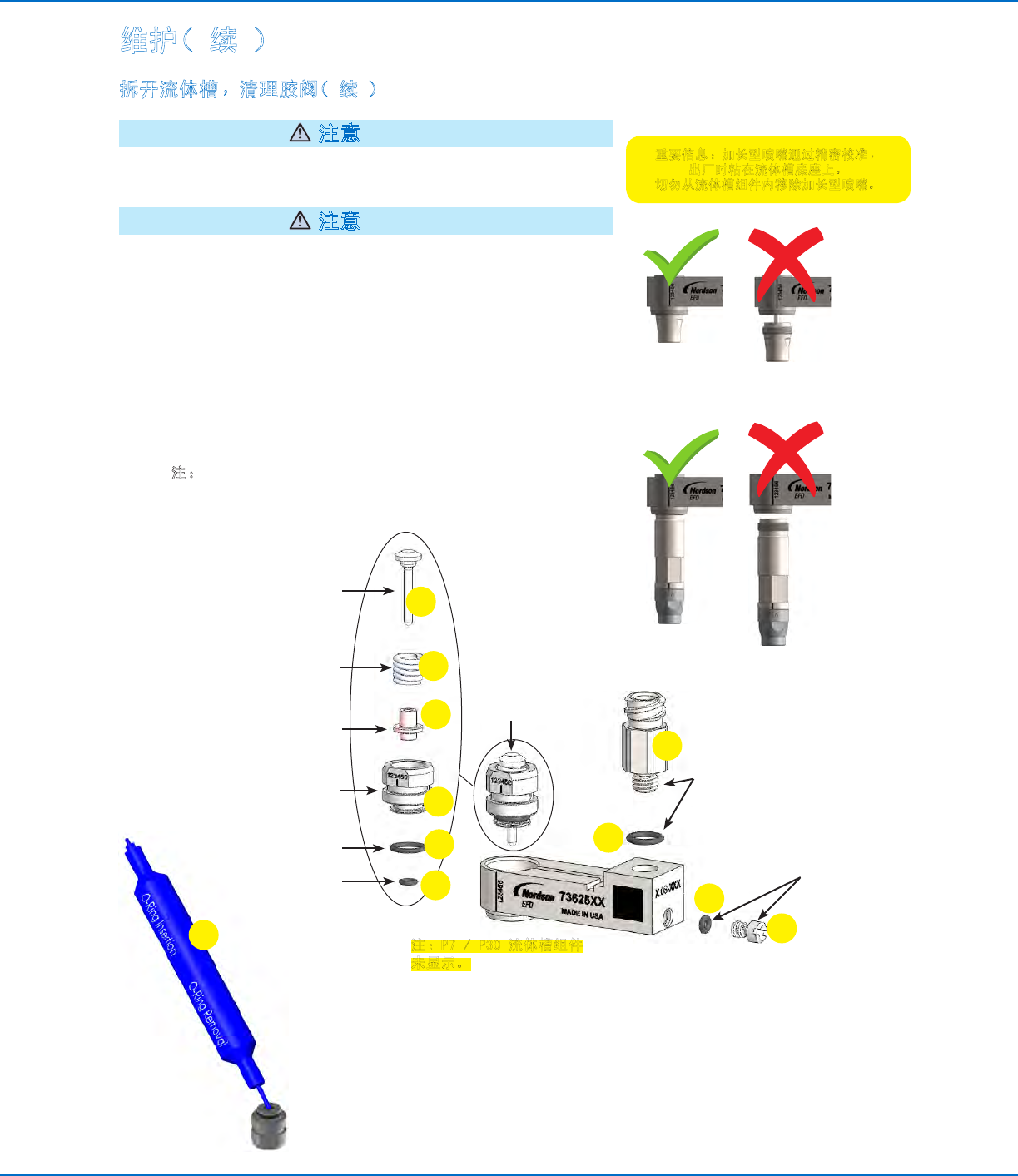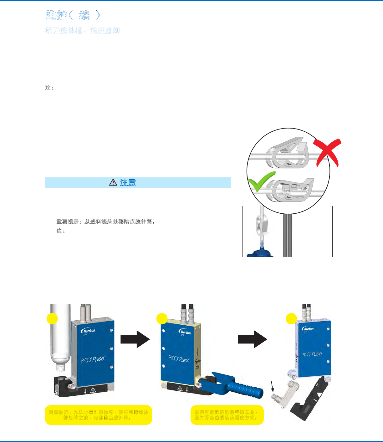 PICO Pμlse 系列点胶阀 www.nordsonefd.com/cn china@nordsonefd.com +86 (21) 3866 9006 诺信 EFD 在全球范围内销售专业点胶系统并提供技术支持服务 17 1. 若还没有这样做,请使用清洗液进行排胶(请参见第16页的“使用清洗 液进行排胶来清洗流体通路”)来从胶阀尽可能多地去除点胶流体。 2. 为系统卸压。 3. 切断对胶阀的供料。 4. 如已安装针头适配器,请移除针…