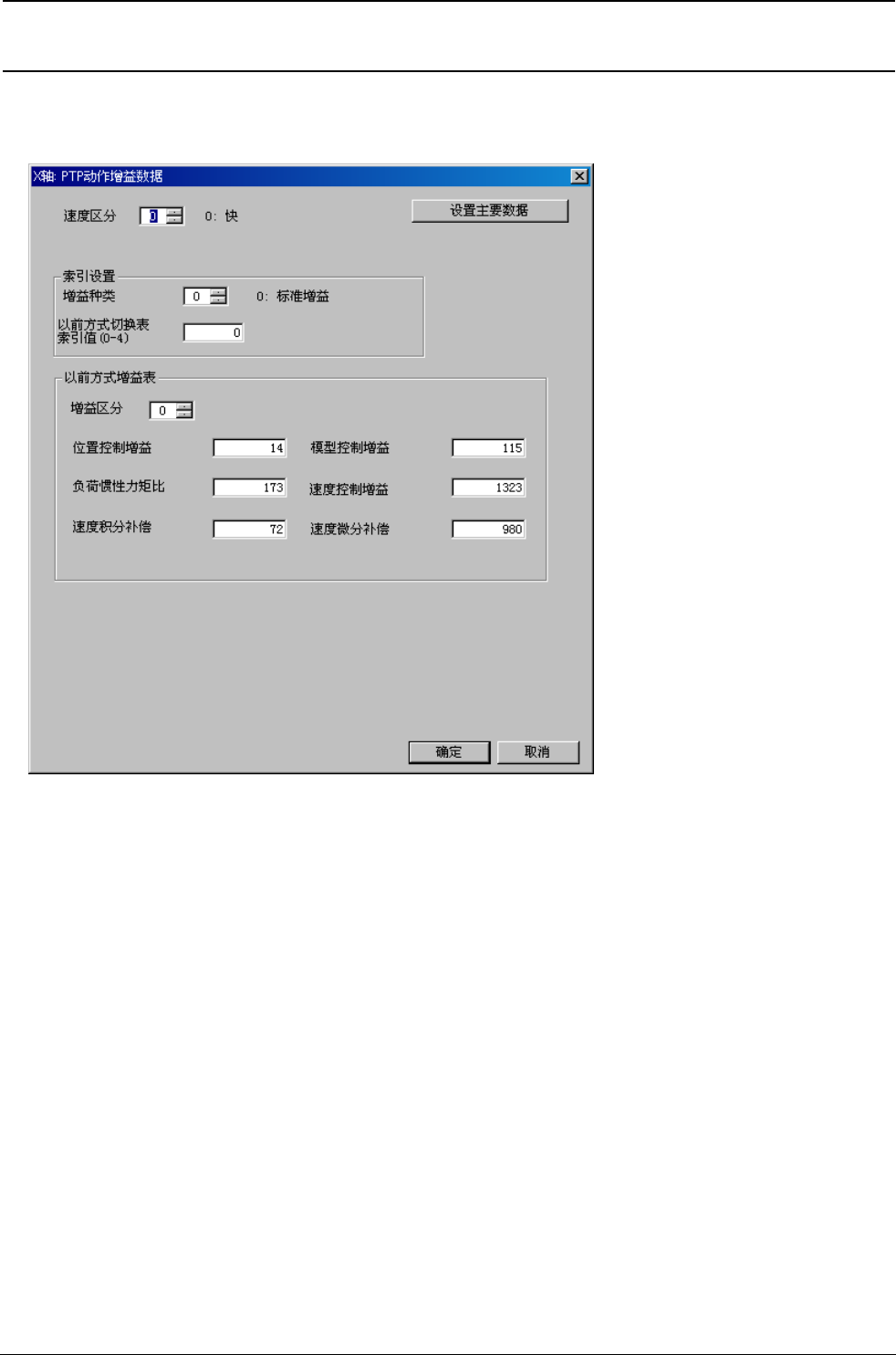 R e v . 1 . 0 机械控制参数 4-12 4-2-2 PTP 动作的增益 图 4-2-2 PTP 动作的增益 (1) 设定画面的显示方法 菜单∶ X 时, [ 输入 ] → [XY] → [X] → [PTP] → [ 增益 ] Y 时, [ 输入 ] → [XY] → [Y] → [PTP] → [ 增益 ] 起动∶ X 时, [ X Y ] 按键→ [X] 标签→ [PTP] 标签→ [ 增益数据 ] 按键 Y 时, [ …