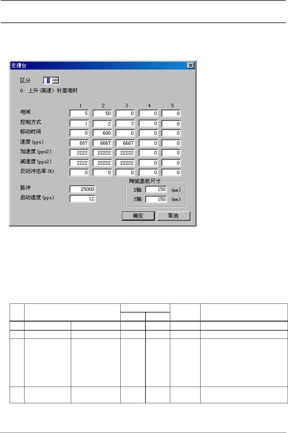 R e v . 1 . 0 机械控制参数 4-35 输入范围 № 项目 最小值 最大值 单位 备考 5 速度 (pps) pps 6 加速度 (pps2) pps 2 7 减速度 (pps2) pps 2 8 支撑台 ( 速度表 ) 反动冲击率 (%) % 控制方式选择 3 的台形驱动时, 此速度表为上限值 9 分解能 脉冲 0.001μm 10 陶瓷基板尺寸 mm 基板尺寸不到该值时,请使用 钳夹时陶瓷用的基板推入量。 注 1) 在 …