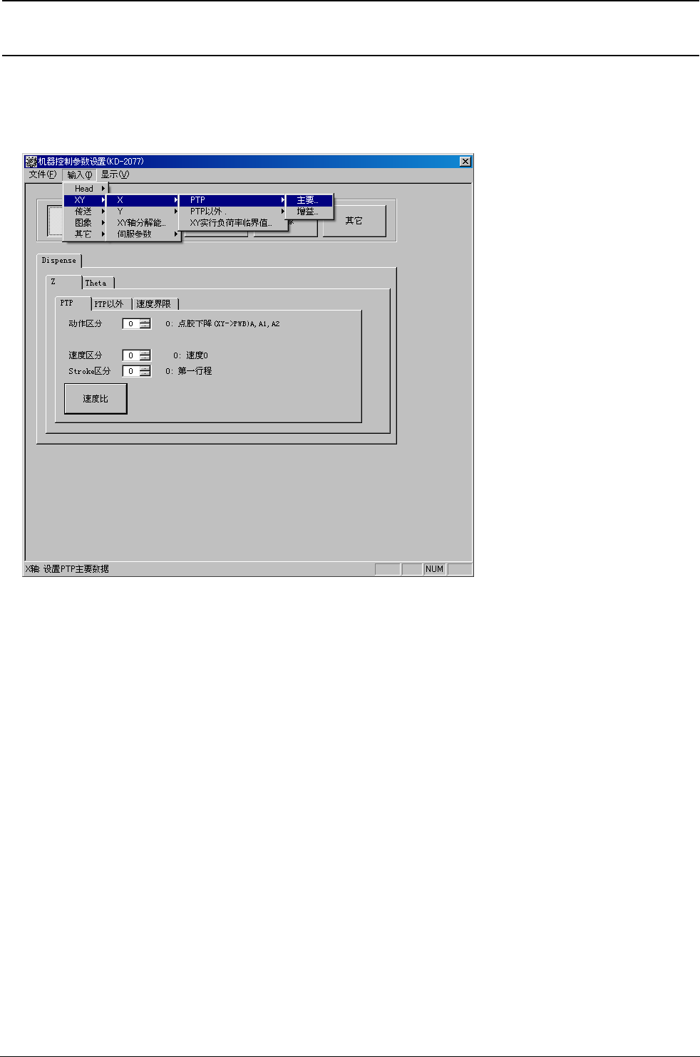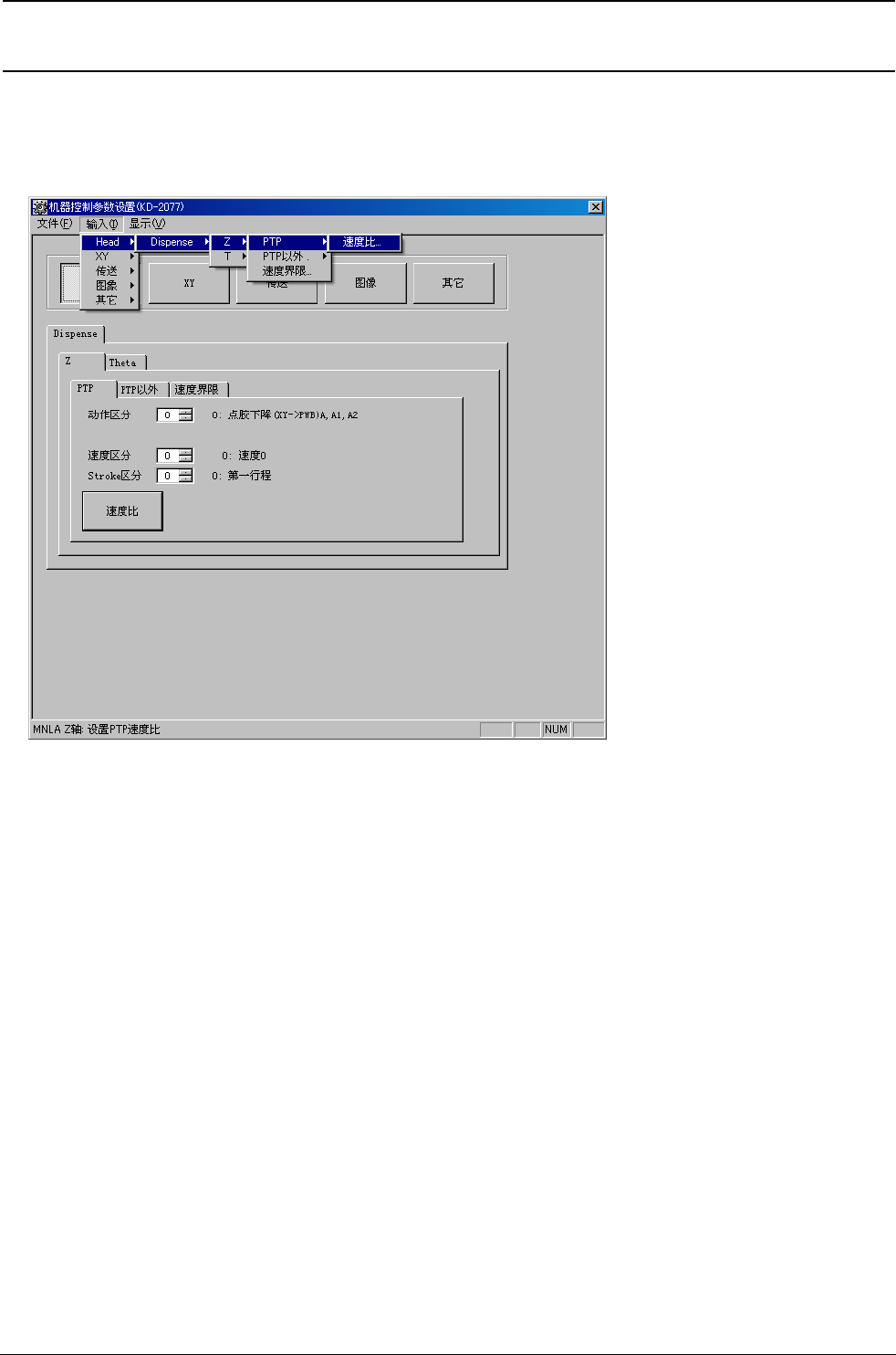 R e v . 1 . 0 机械控制参数 2-3 2-2-1 点胶头 选择了 [Head] 之后,就会如图 2-2-1 所示显示出级联菜单。 图 2-2-1 点胶头菜单 (1)Dispense 进行点胶头 (Dispense Head) 的 Z 轴, θ 轴的设定。 ( a ) 进行 Z 轴的 PTP 动作的速度比的设定。 (c) 进行 Z 轴的 PTP 以外的动作速度比的设定。 (e) 进行 Z 轴的速度限制呼出、分辨率的设定。 ( …