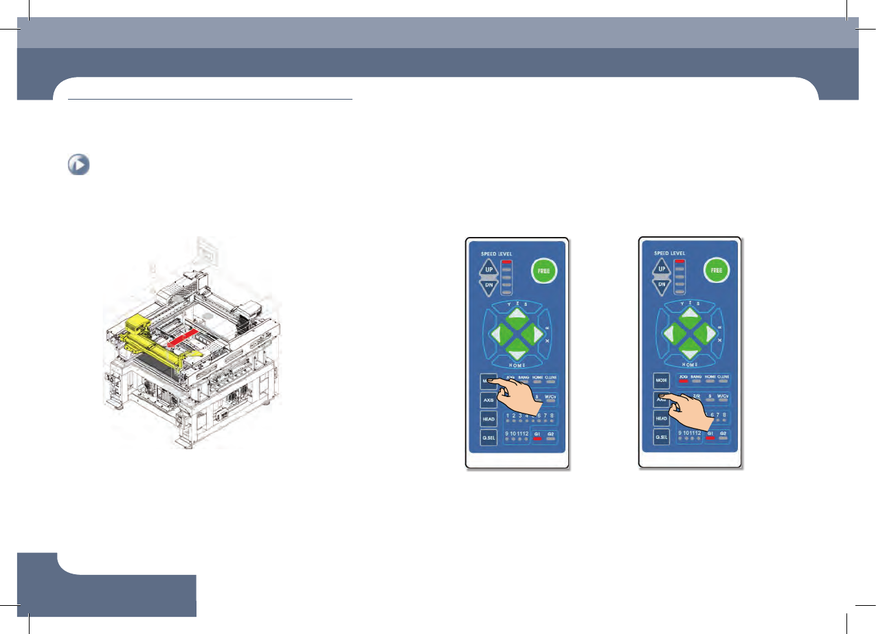 Chap ter 1 本部分介绍设备维护作业环境、作业工具、维修项目等。 维护条件 Adv ance d Fl ex ib le P la cer DE CAN F2 M ai nt en an ce H a nd bo o k 1-4 维护前共同执行程序 维护条件 5. Front X Frame 前面移 动 5. Front X Frame 后面 移 动 1. 按 'MO DE' 按钮 按 'JOG&a…