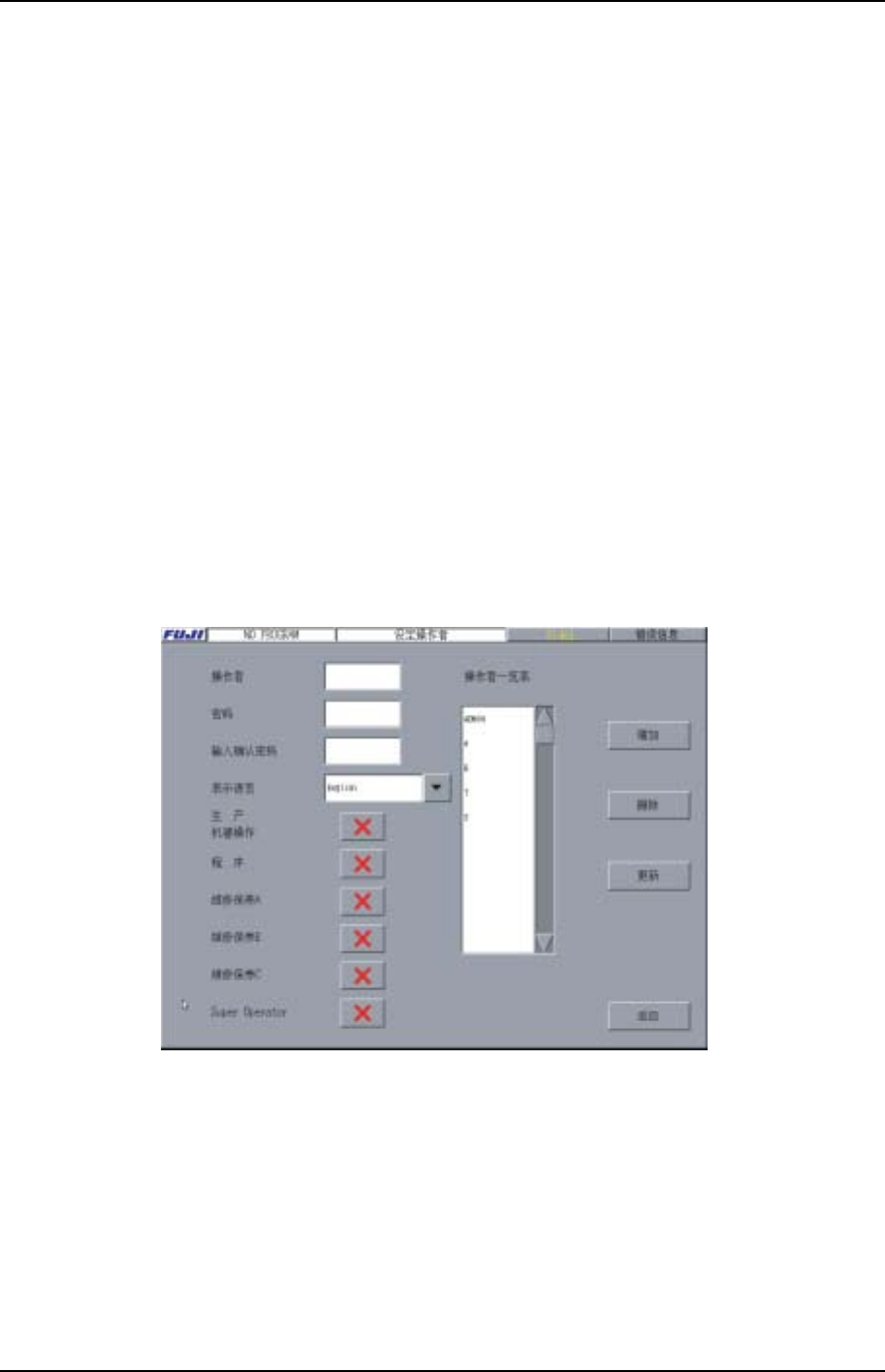 机器启动时增加的操作者名会显示在操作者清单中。有关操作者的客户化请参阅以下章
