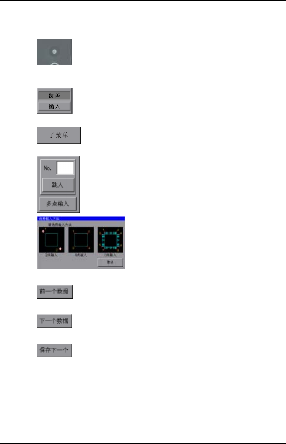 第 3 部 第 3 章 编辑器 Edition 1.0 3-3-9 XP-242E 系统手册 注 册编辑数据和当前的 X , Y 坐标 , 然 后结 束 操作。 不 注 册 任何 数据结 束 指教操作。 设定 X , Y 轴 的 JOG 操作 模 式。 更改设定后, 箭头颜色 和 JOG 点动 模 式也 变 更。 在移动量 模 式 ( 兰色 ) 时, 每 按一次下面的按 键 就 以此移动量进行移 动。 在 速度模 式 ( 绿色 ) 时,…