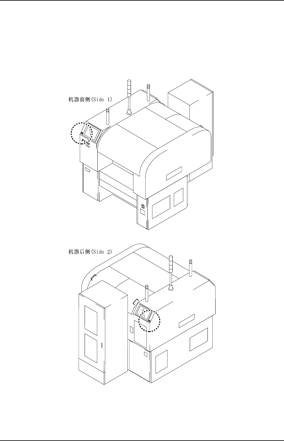 发生紧急情况时,请按下任何一个红色的[紧急停止]按钮,使机器停止。[紧急停止]按钮的