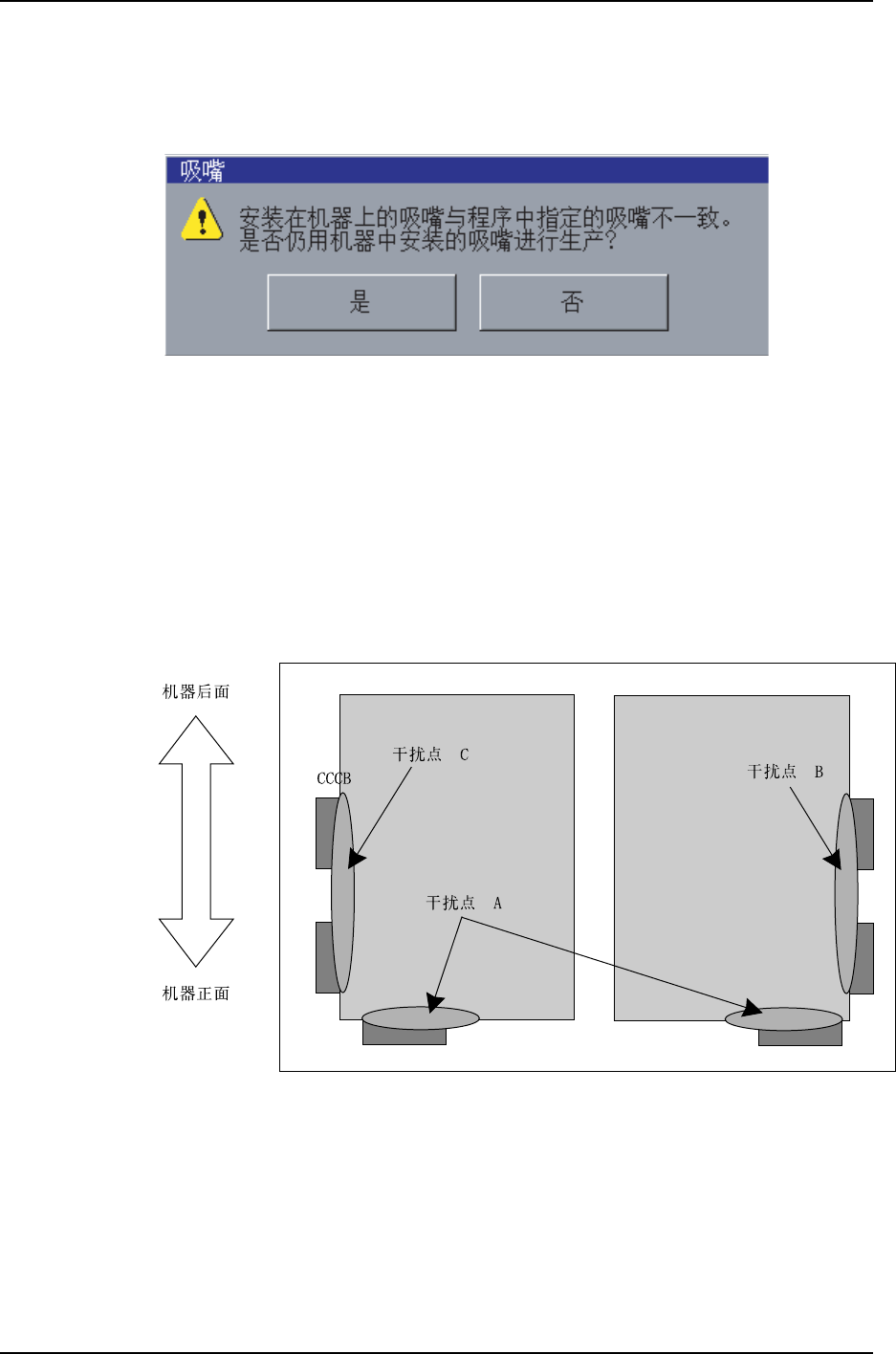 如果在机器上安装的吸嘴和程序与指定的吸嘴不同,会显示出一个询问是否在生产中使