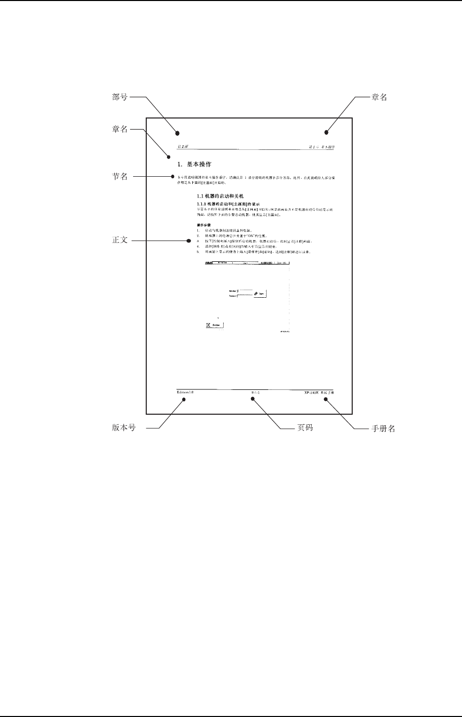 1. 各页中除了正文以外有部编号、章名、节名、版本号、页码以及手册名构成。