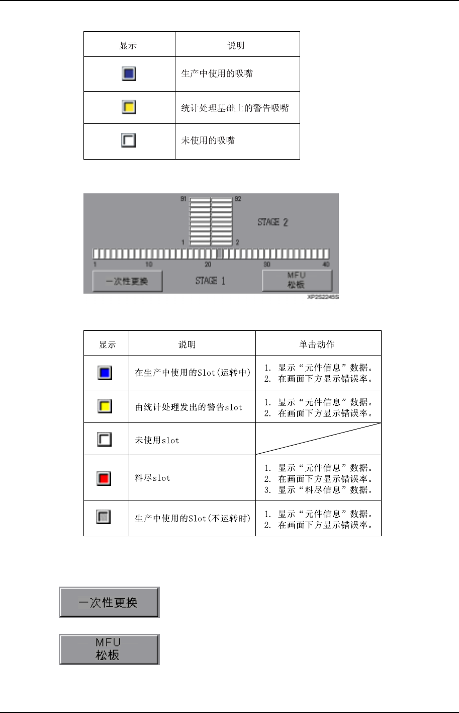 第 2 部 第 1 章 基本操作 Edition1.0 2-1-21 XP-242E 系统手册 XP2S2243S 显示各吸嘴的状态。 显示供料 平 台 XP2S2244S 显示 Slot 的状态 选择此按键,使 平 台上所有 Sl ot 进入元件安装状态。 MFU 松 板。