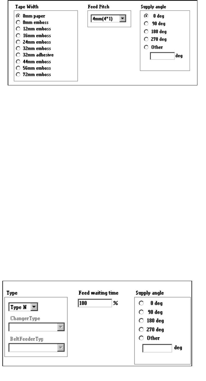 4 – 74 4.7.3 Tack control section (Component package page) 1) W hen “ T ape” is selected ① T ape w idth Select the appropr iate tape width with the corresponding radio button. ② Feed Pit ch Select the f eed pitch f rom t…
