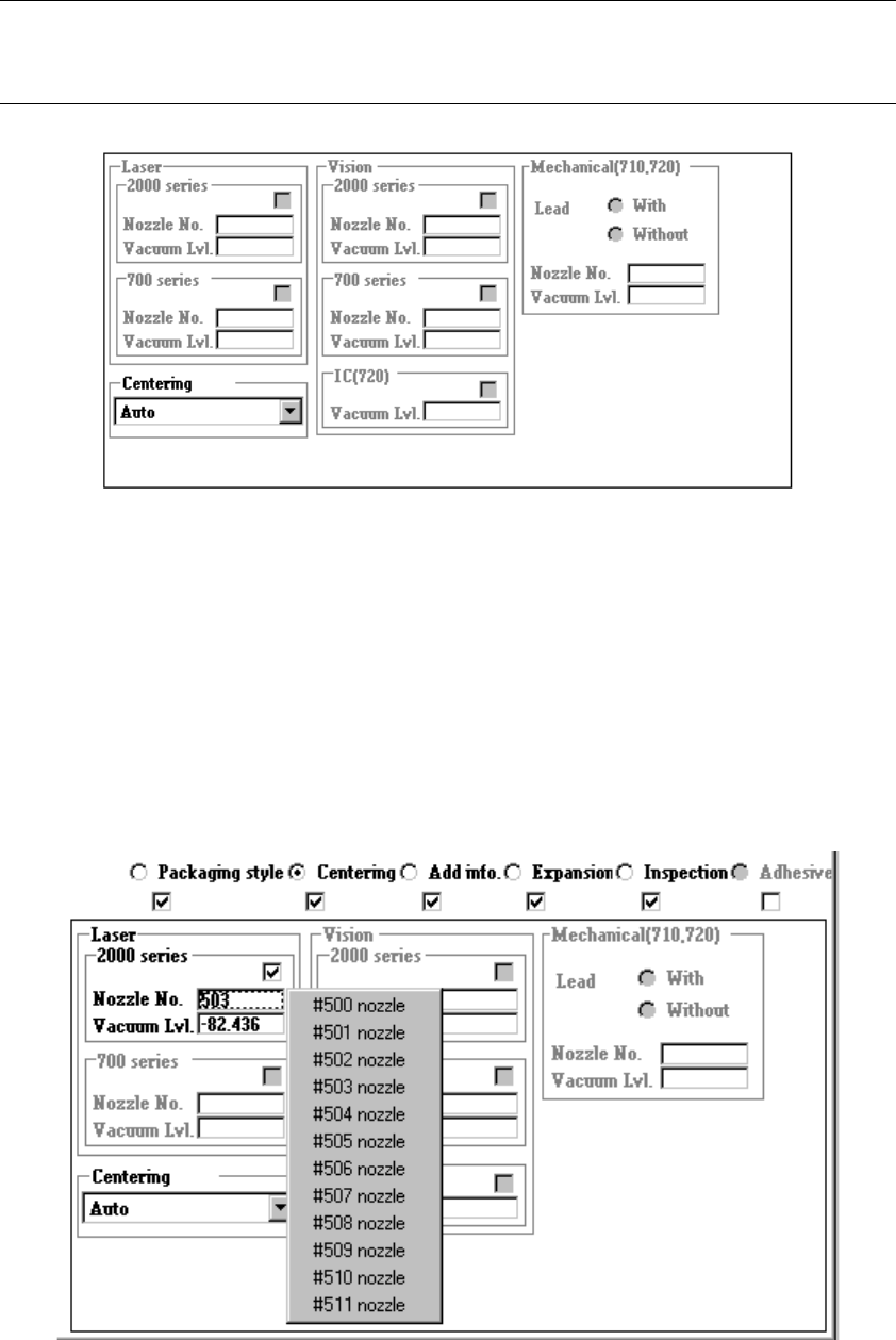 4 – 78 ② V acuum Lvl (level) W hen producing PW Bs, the machine uses the vacuum level obtained when no component is pick ed (to be set on t he Machine Setup menu) and the value set with this V acuum level menu item t o d…