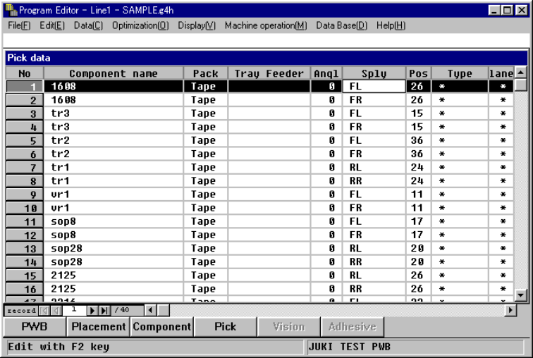 The items “Component name”, “Pack.”, “Tray Feeder”, and “Angl” are always