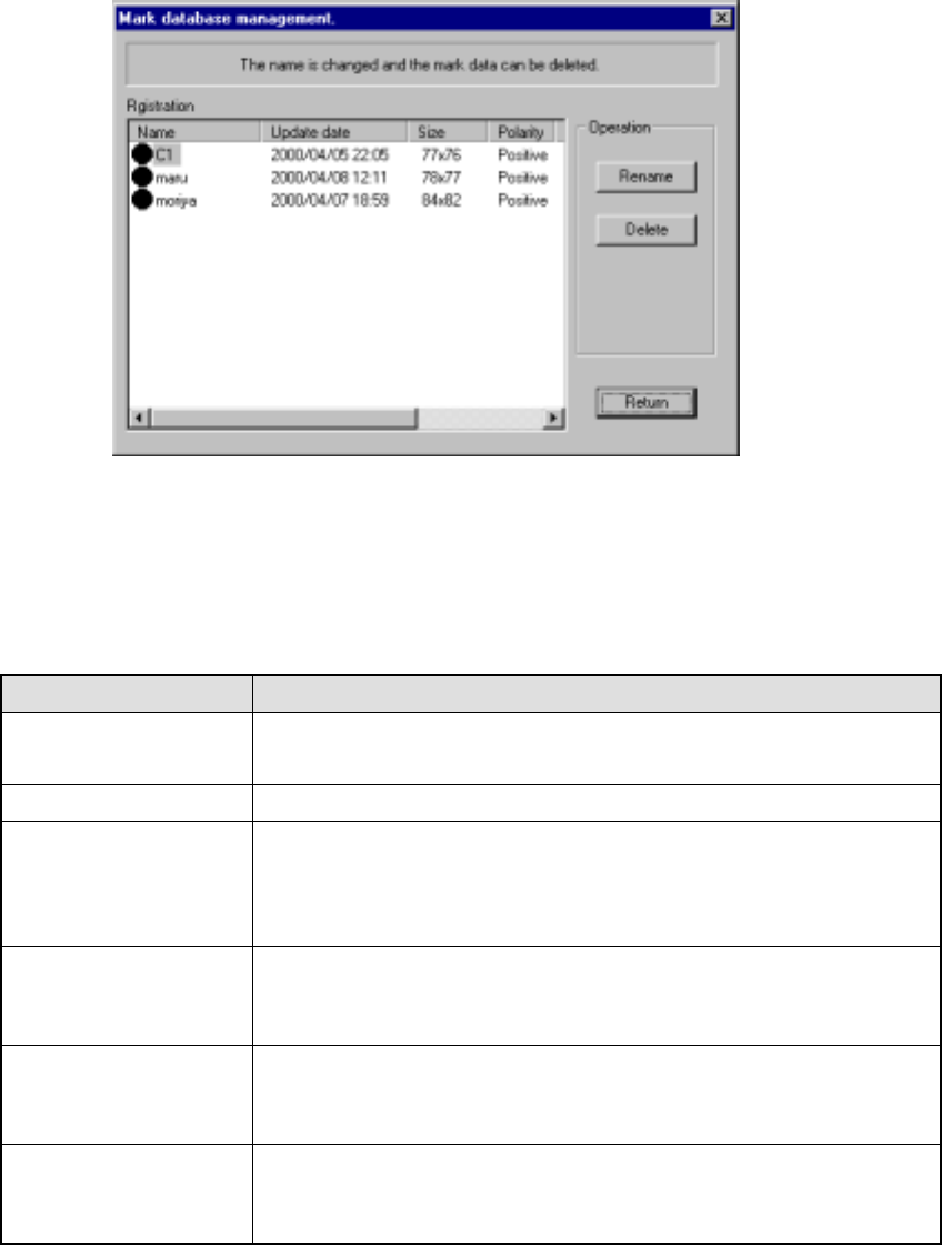 4 – 216 4.12.4 Mark database This command m anages the m ark dat abase which was registered during t eaching of mark data described in Chapt er 5 "T EACHING" . Figure 4.12.4. 1 "M ark database management&q…