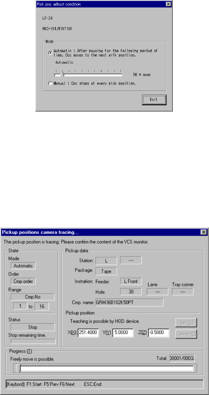 6 − 49 Figure 6.3. 3.2.1 Pos. adjust condi tion dialog box ② Start ing tr acking oper ation W hen the "Pick pos. adjust condit ion" dialog box above in Figure 6.3. 3.2.1 appears, press t he <START> switch…