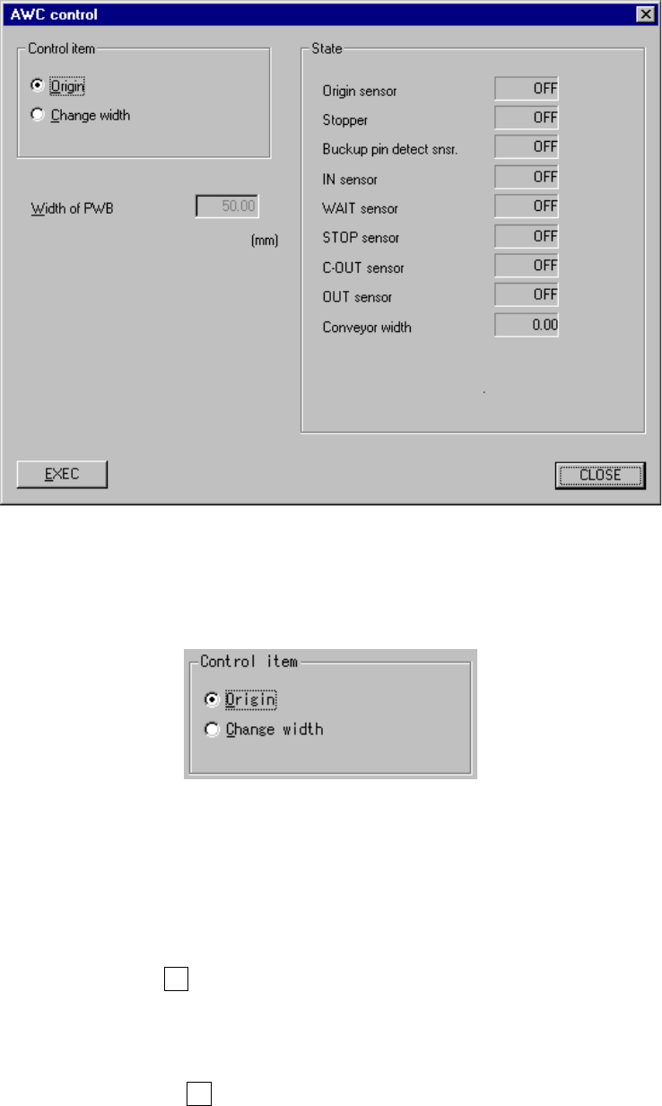 8 − 39 8.3.3 A utomatic PWB w idth adjustment control W hen y ou select the [ Conveyor] command on the [Ct rl] menu, then the [ Auto width conveyor control], the f ollowing “AW C control” dialog box appears on the screen…
