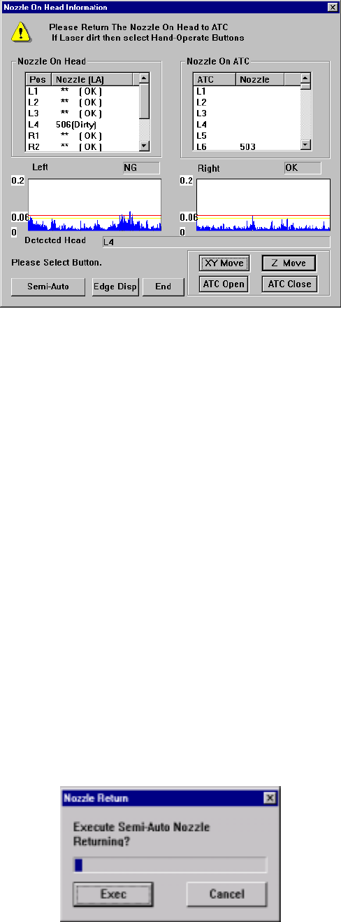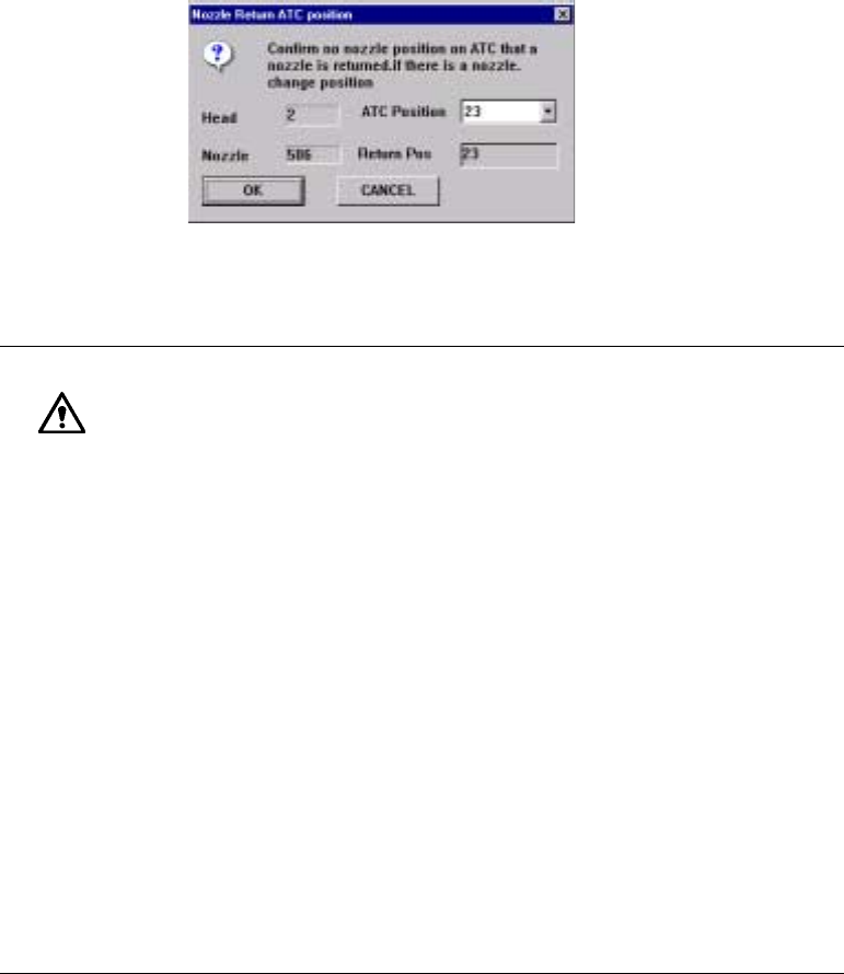 9 − 24 ◇ Return t he nozzle attached on the head to the AT C on this screen. Figure 9.5.1.2 “Nozzle O n Head Information” screen ● Ther e are two ways for retu rning a nozzle to the AT C: “Semi- Auto Nozzle Returning ” a…
