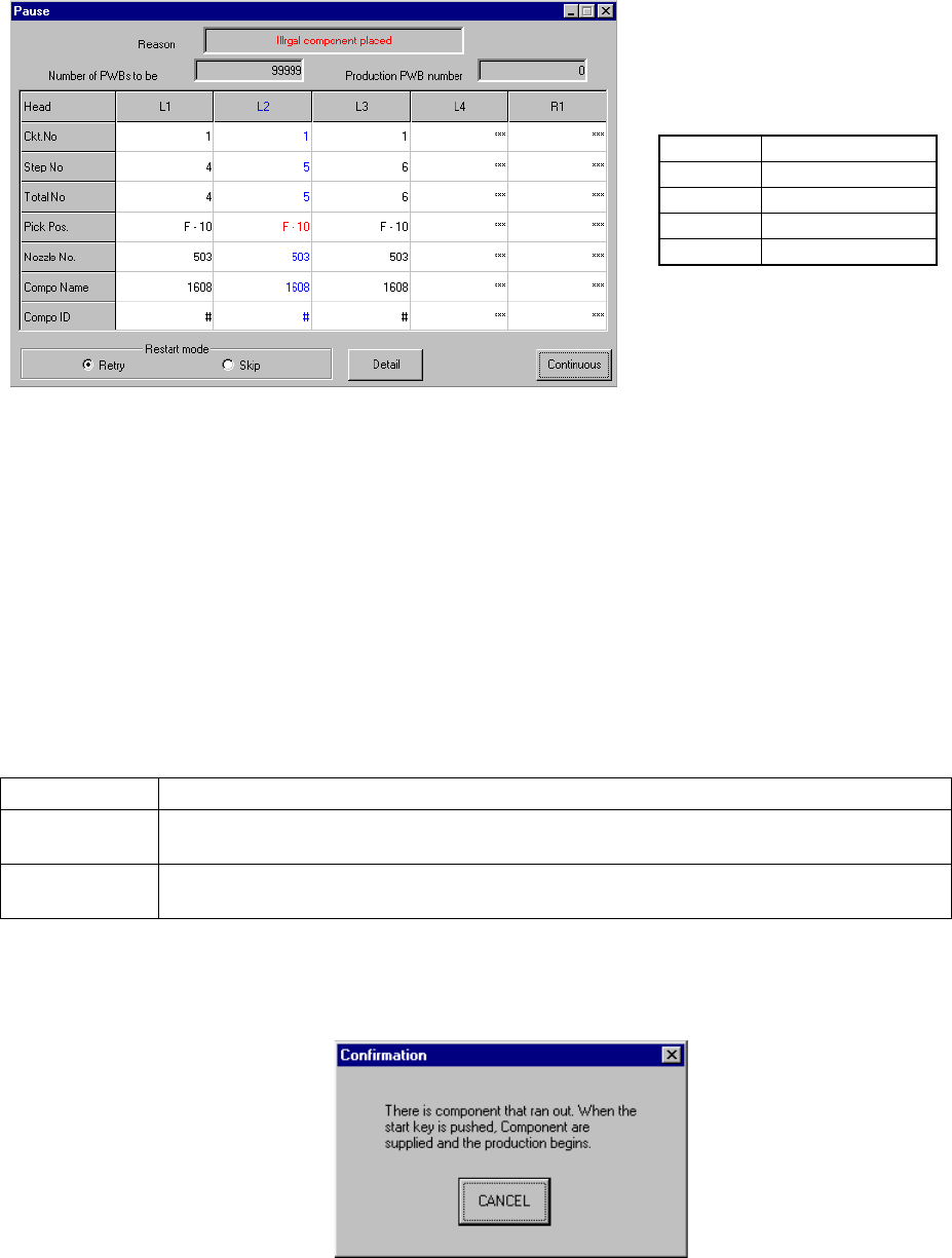Skip The system skips the pick-up/placement cycle of the component which caused an error, and