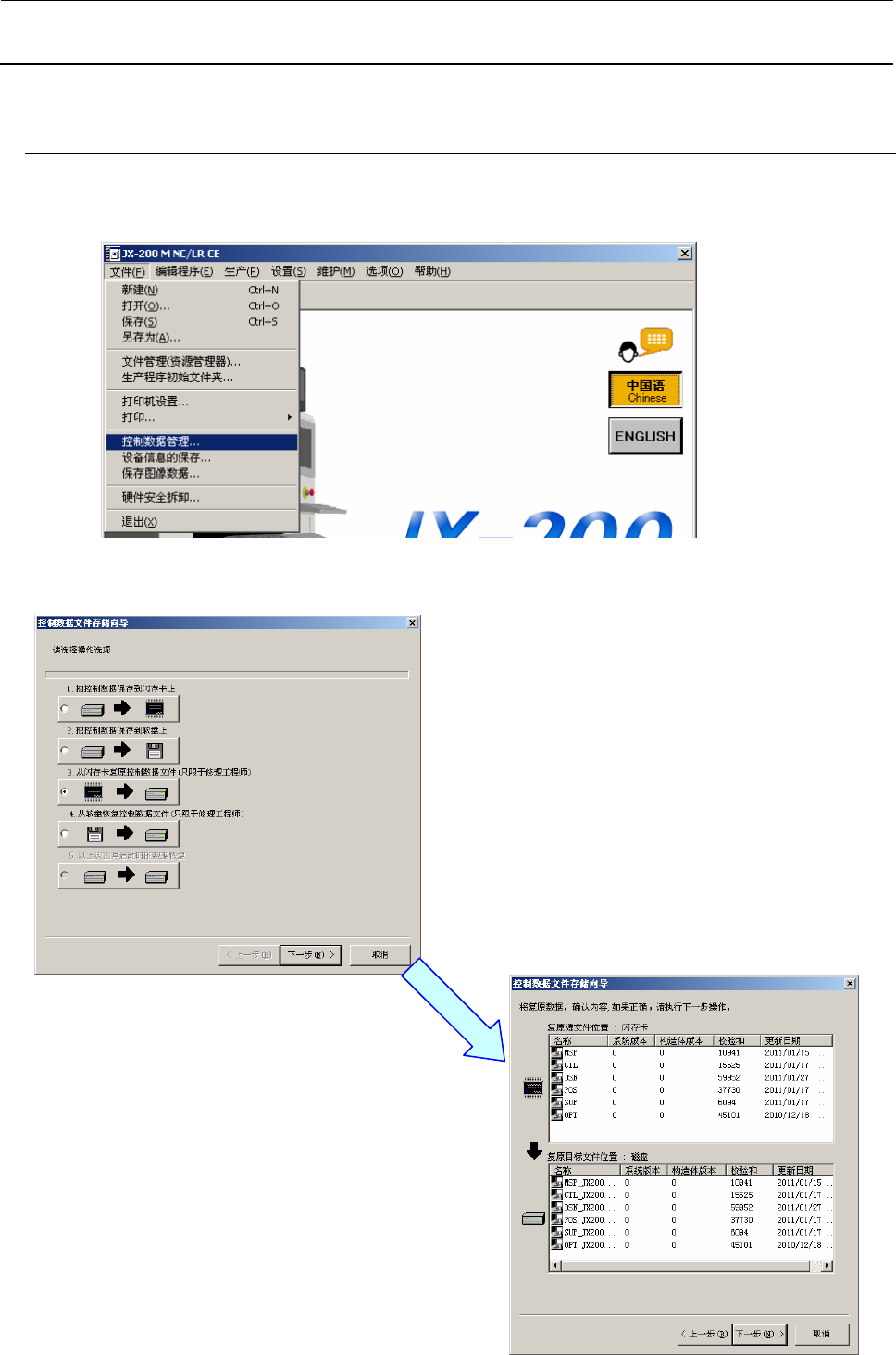 Rev. 1.0 MS 参数 1-11 1-4-4 . 从闪存卡复原的方法 复原后备文件时,请按照以下的程序进行。 ① 请选择文件 → 控制数据管理。 ② 控制数据文件存储向导被显示出来。这时,请选择 「 3. 从闪存卡复原控制数据文件」, 然后选择下 一步( N )。 ③ 请从复原来源选择文件,确认复原到何处后选择 下一步( N )。