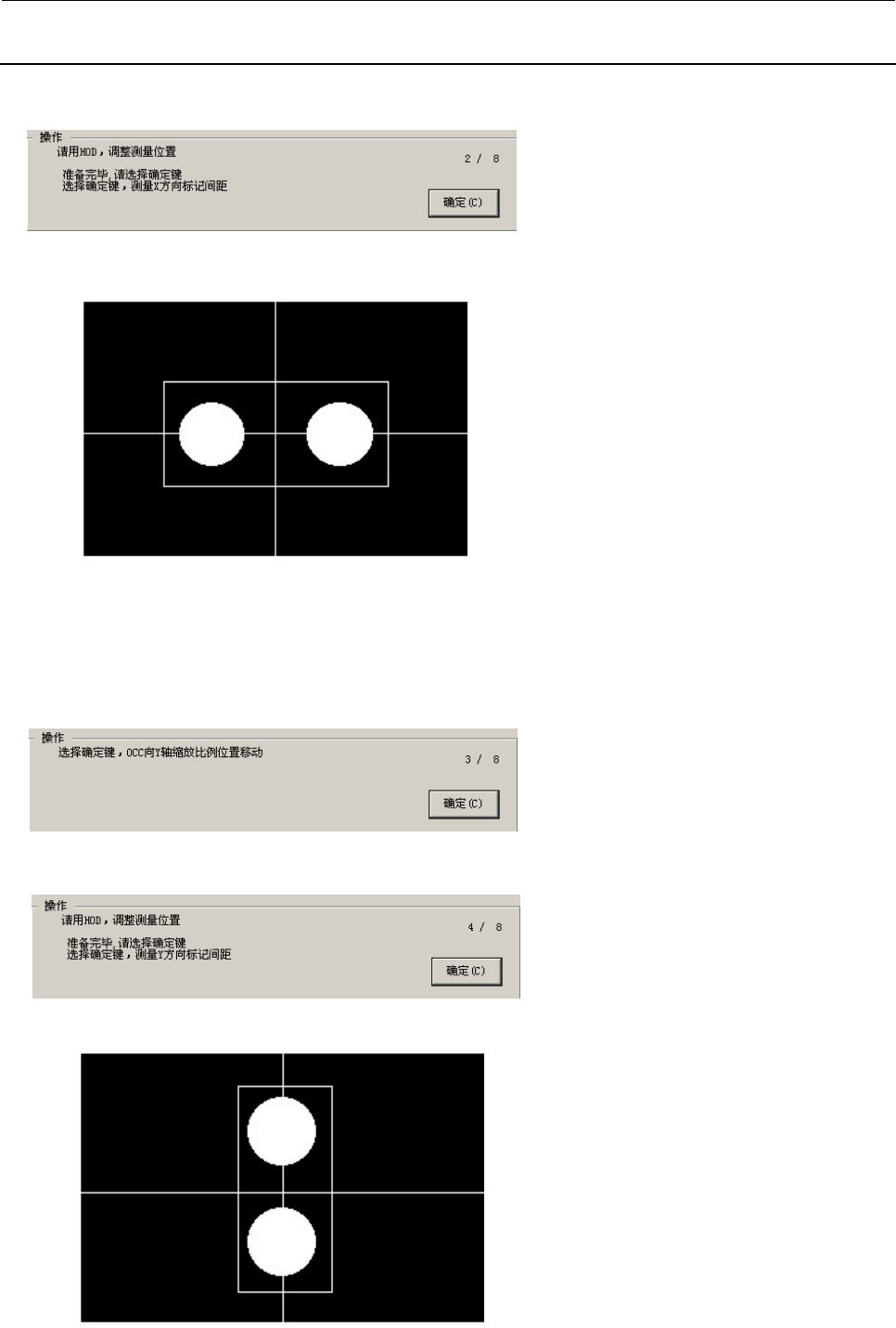 Rev. 1.1 MS 参数 4-10 < 操作 ・2/8> 让下图的标记可以看得见 。 通过演示, 把监视器十字游标调整到这 2 个标记的中央,按 HOD 的确定键 。 不需要调整时,则不需要演示 。 此时, 在摄像机视野内如果看得到标记以 外的尘埃时,把摄像机调节治具擦干净, 以便能看得见标记 。 测定时, 如果检测出标记以外的东西时, 就不能获得正确的值, 或成为异常 。 选择确认之后, 测定 X 方 向的标记间的距离。 结束测定…