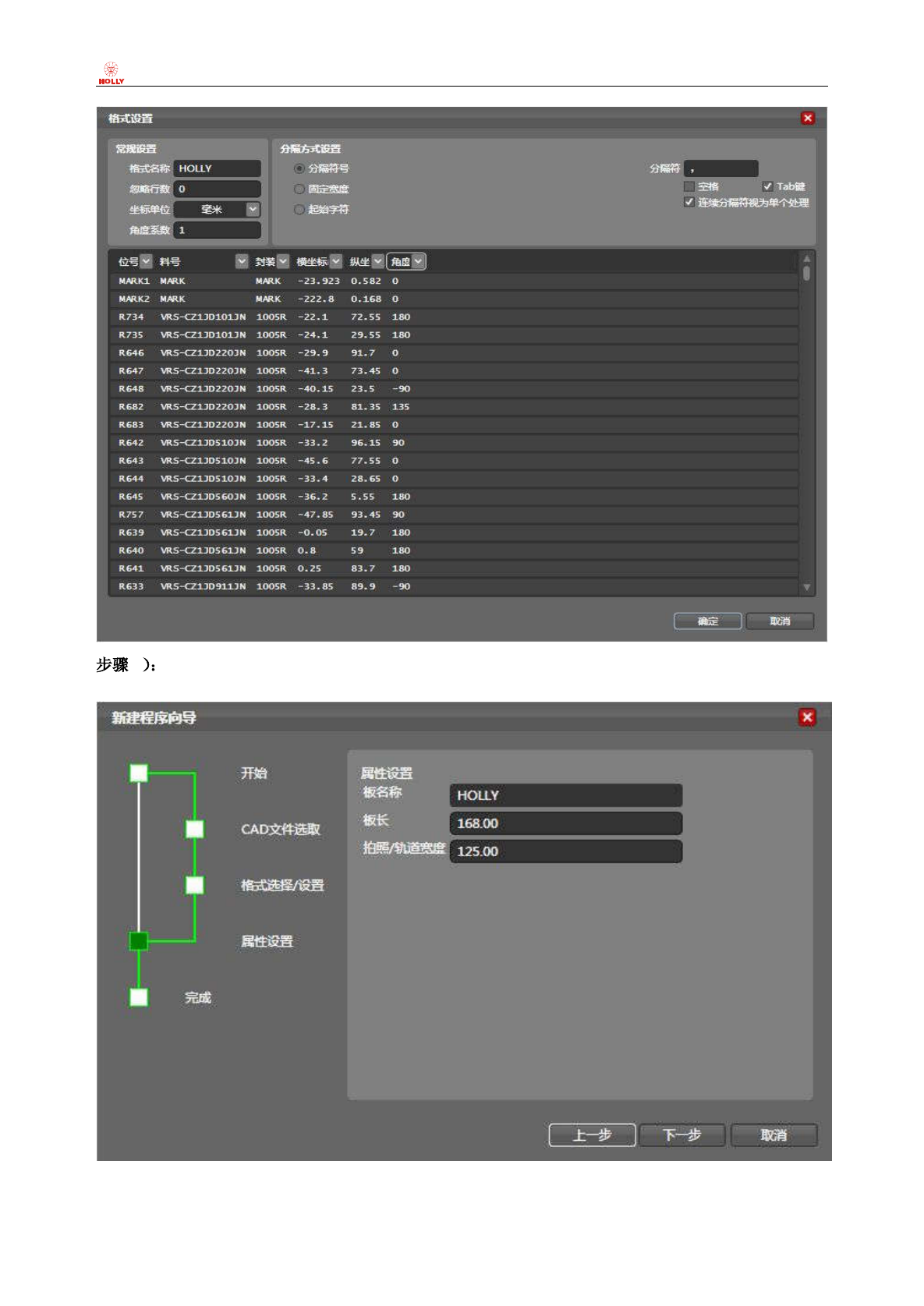 上海赫立电子 科技有限公司 在线型自动光 学检测仪 使用手册 第 16 页 共 64 页 6 屏幕返回到 “新 建程序向 导” 对 话框, 点击 “下 一步” , 对所测 PCB 的属性 (长 度、 宽度及板 厚尺寸)进行 设置,完成设置 后点击“下一步”按钮 ;