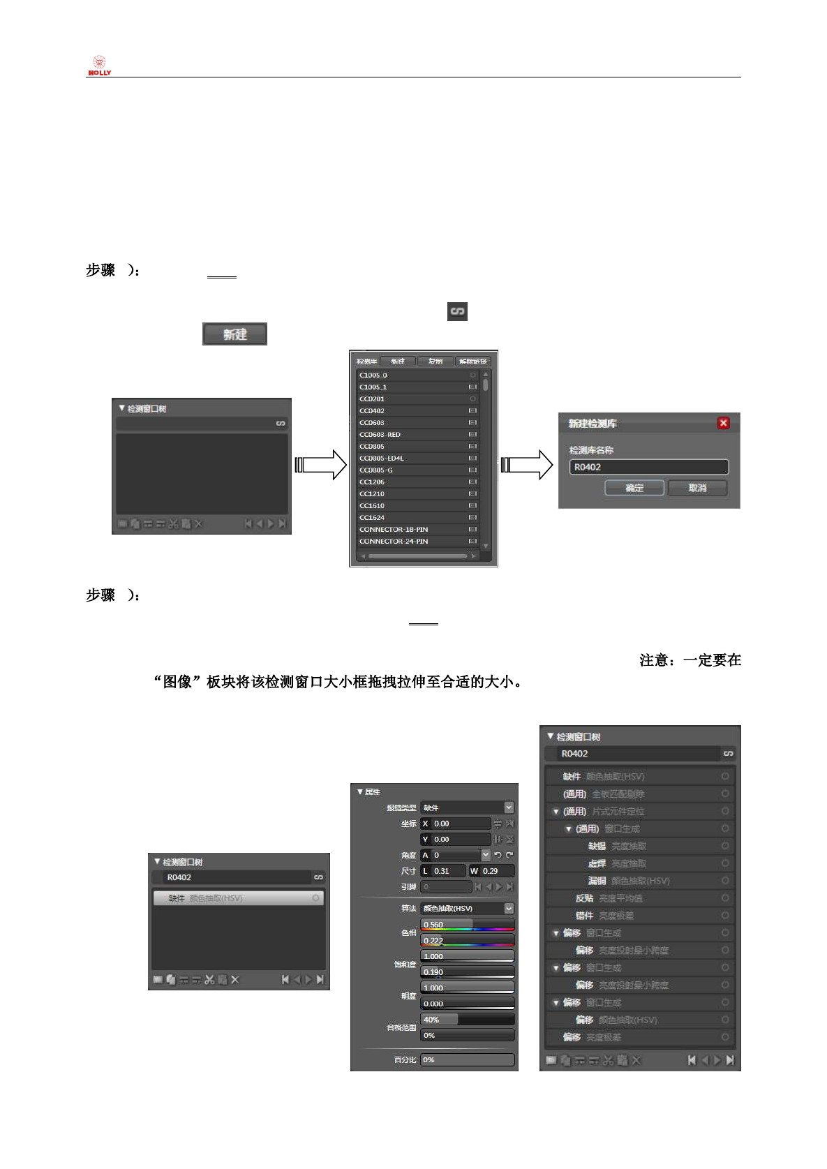 目录,“赫立 AOI 系统软件”将切换成检测库编辑界面,在“检测窗口树”板块点击右侧的“检测库新