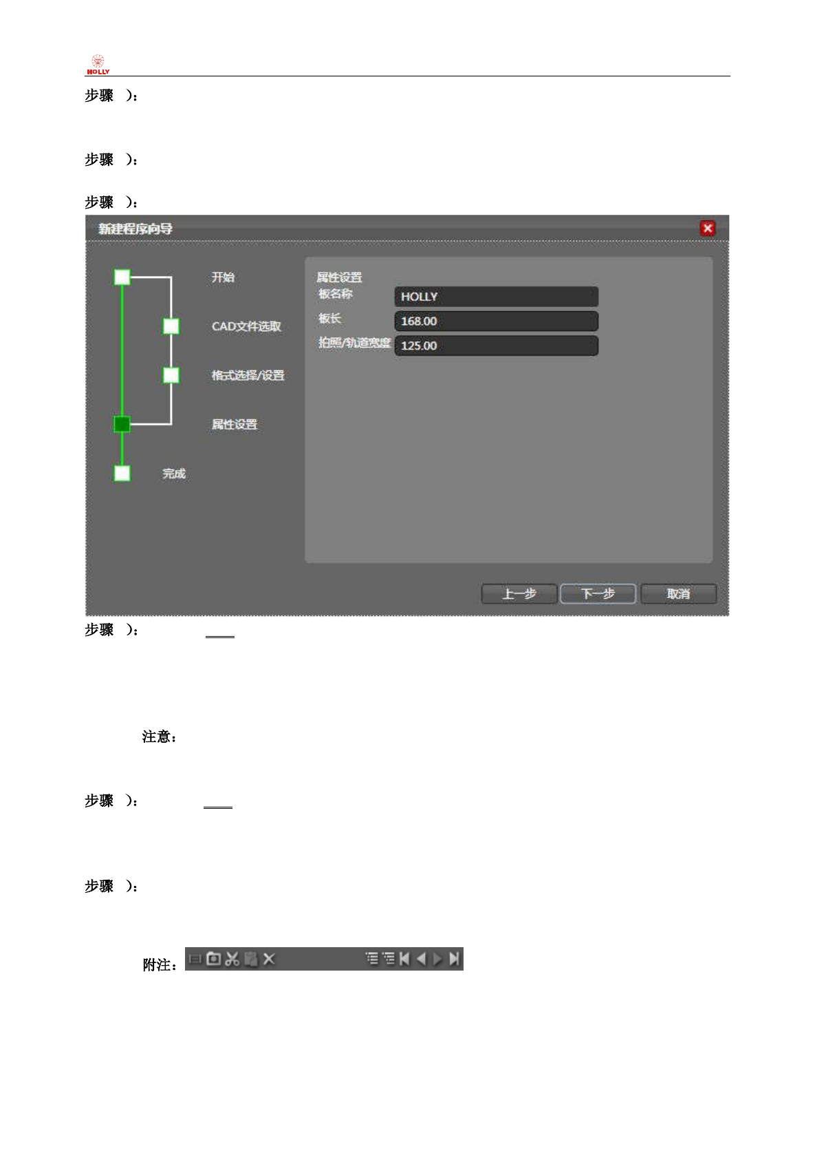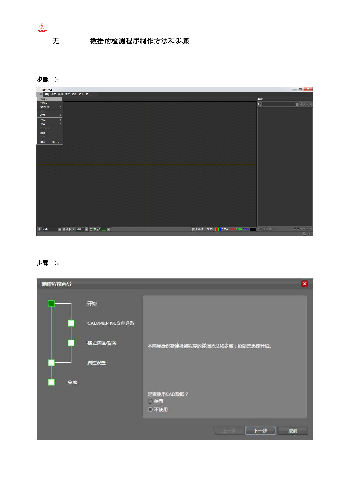 上海赫立电子 科技有限公司 在线型自动光 学检测仪 使用手册 第 31 页 共 64 页 2-5. CAD/NC 本章节主 要 讲述 没有 CAD/NC 数据 时的检测程序 制作方法和步骤, 1 点击 “赫立 AO I 系统 软件” “ 文件”主菜单, 选择“新建”子菜 单项; 2 在弹出 的 “新建程 序向导” 对话框内 , 按照提 示选中 “不使用” CAD 数据单 选按钮, 点击 “下 一步”按钮继续 ;