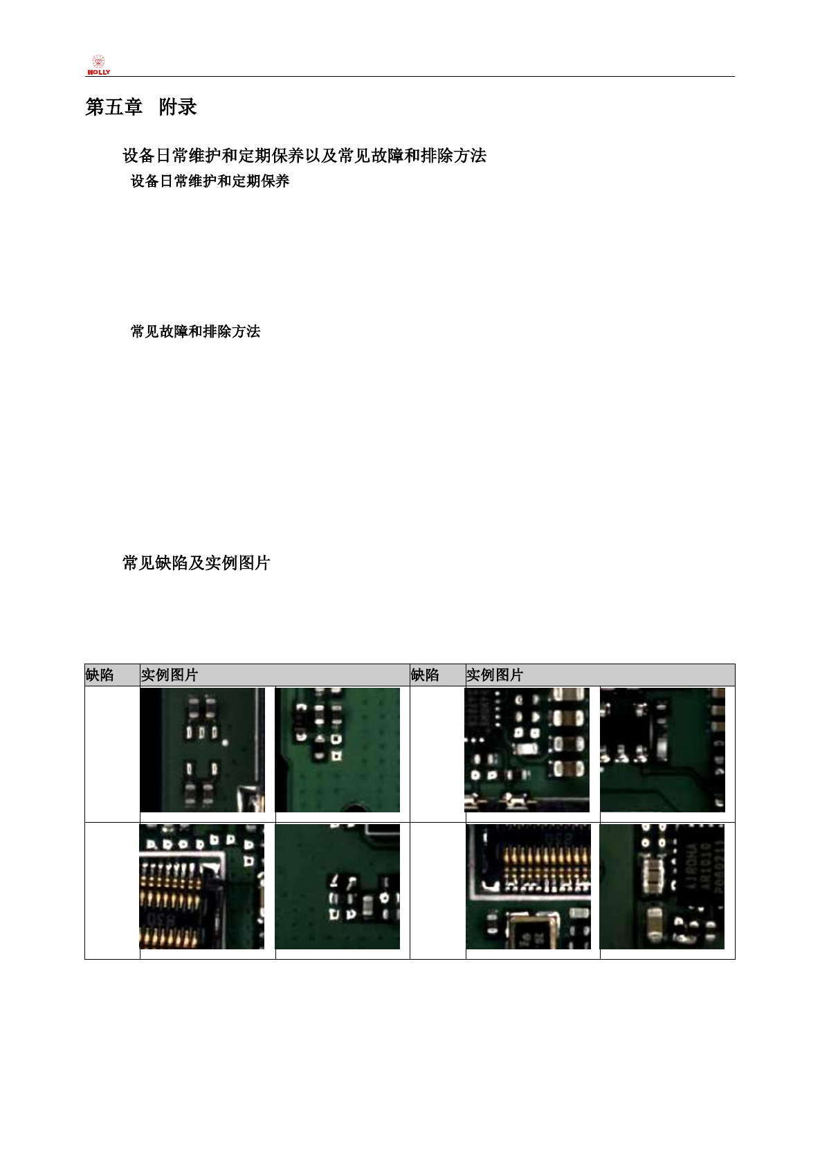 锡、露铜、元件浮起、IC 引脚浮起、IC 引脚弯曲、XY 偏移量数据输出等。请参看如下外观缺陷实例图: