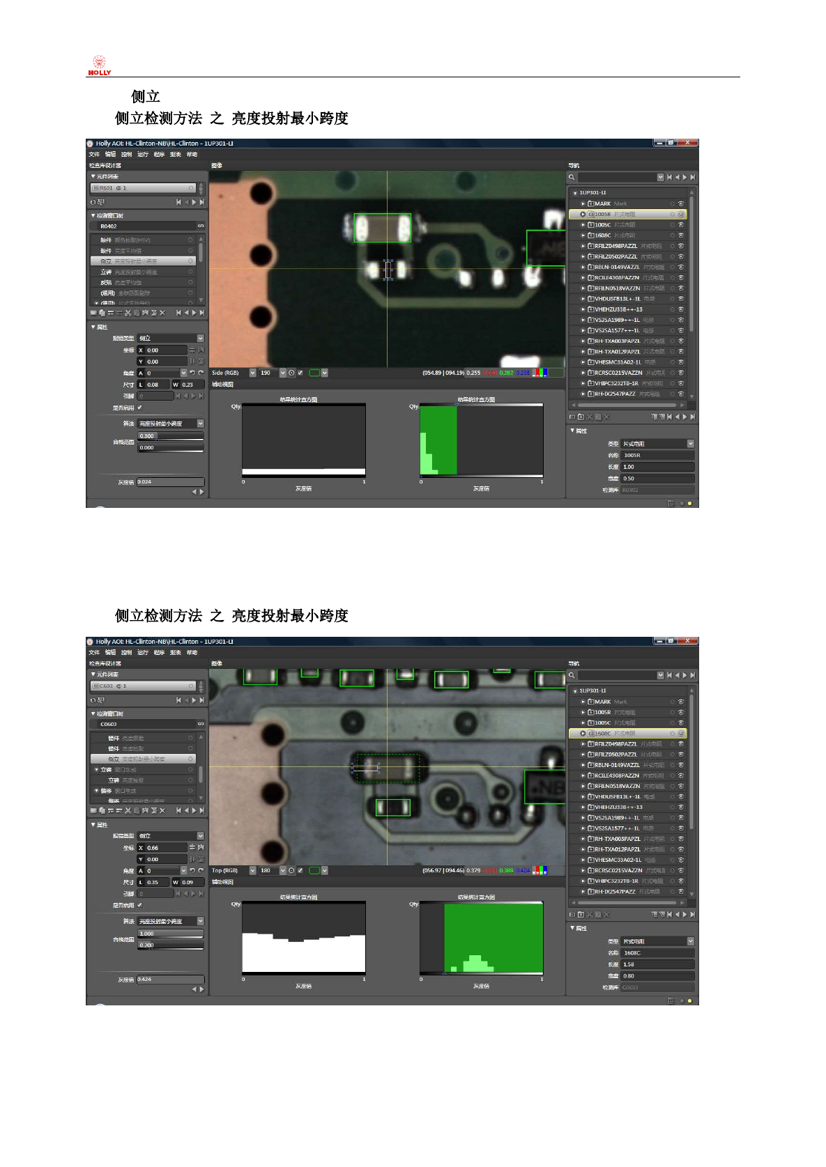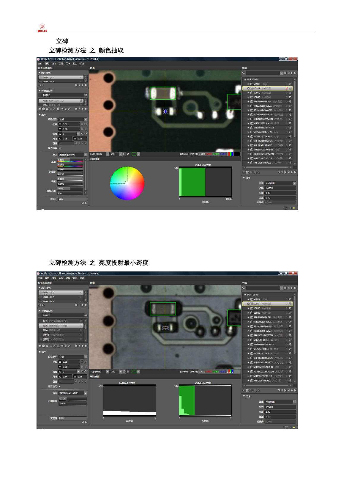 上海赫立电子 科技有限公司 在线型自动光 学检测仪 使用手册 第 56 页 共 64 页 5-4-3. a) 1 在 Side ( RGB ) 真彩色 图像模式下: 当电阻 元件没有侧立 时, 当前窗 口没有任何的亮边 横向贯穿, 结果 数值相 对较小; 当 电阻元件 侧立时, 电 阻的侧向 亮边就会横向 贯穿当前检测窗口,亮度投射最 小跨度的 结果值则 相对较大。 b) 2 在 T op ( RGB ) 同轴落 射照明图像模 式下: …