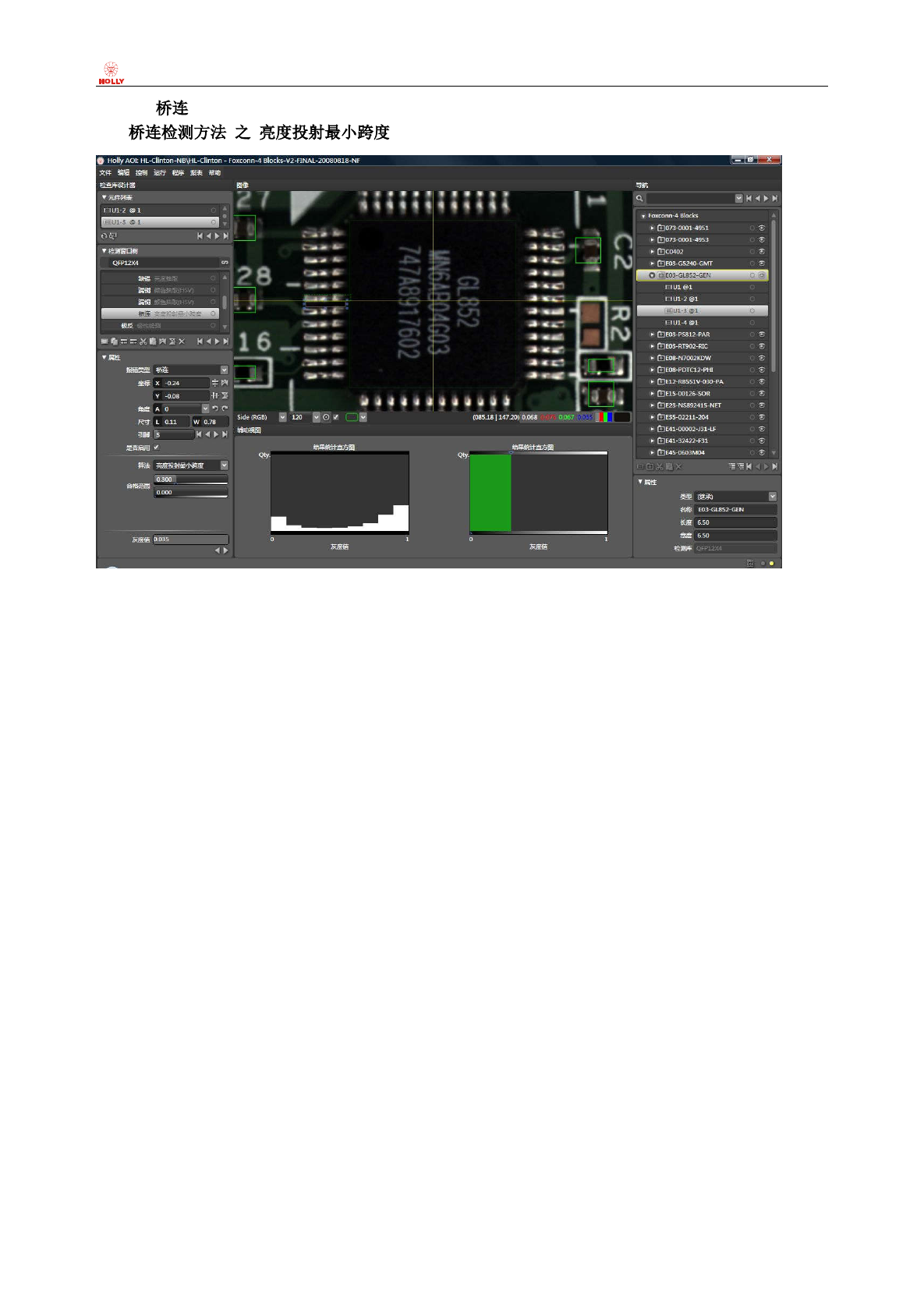 数值相对较小;当 IC 引脚间有焊锡横跨桥连时,检测窗口内有亮边贯穿,则结果数值相对较大。