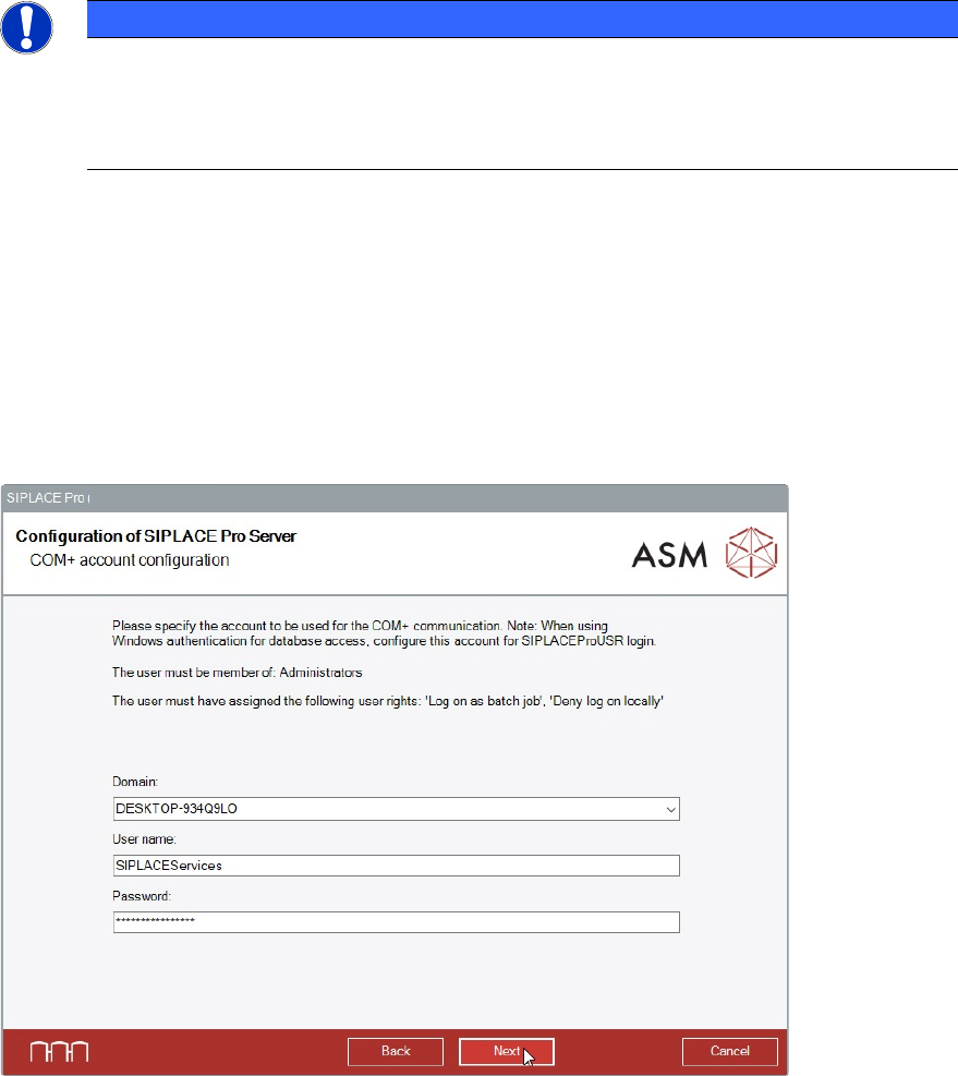 In this dialog you specify under which Windows user account the server component of SIPLACE