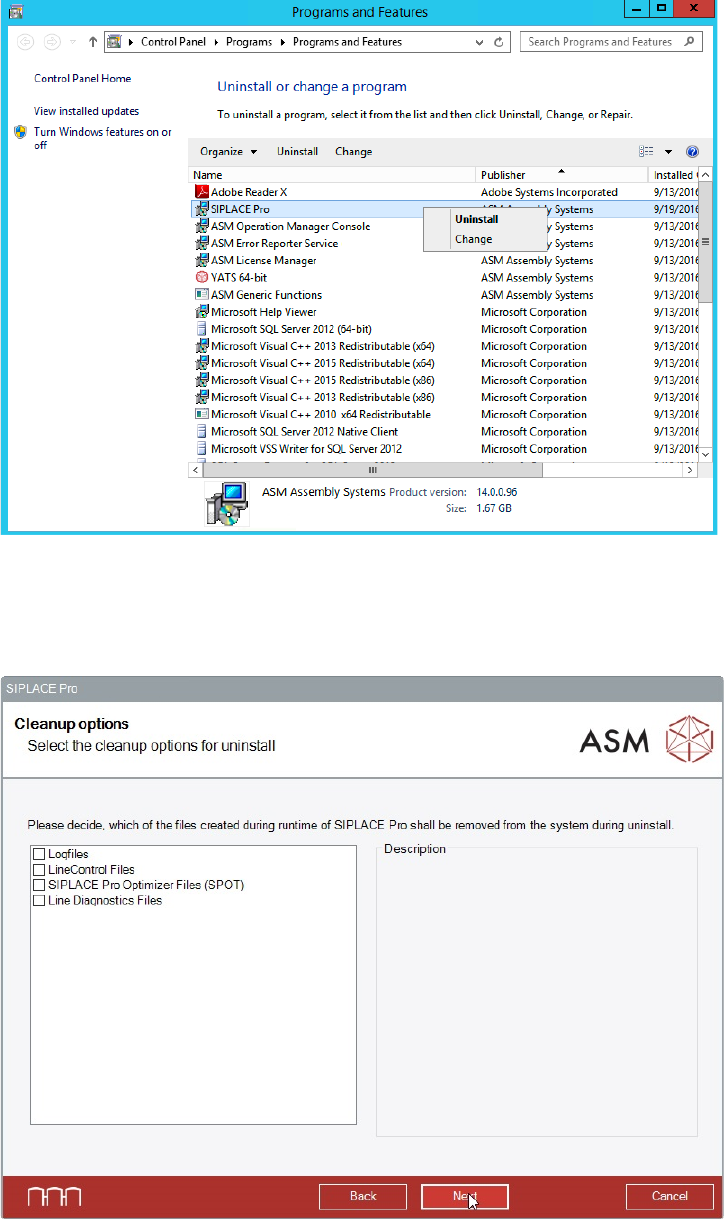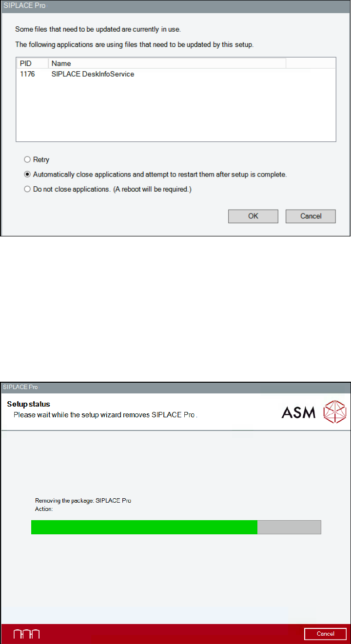 SIPLACE Pro 15.1 (R18 - 1) / Installat ion Manual 05/2018 Edition 62 SIPLACE Pro is now ready to be removed. The following dialog is display ed. Figure 9-4: Removing SIPLACE Pro ► Click the Rem ove button to confirm unin…