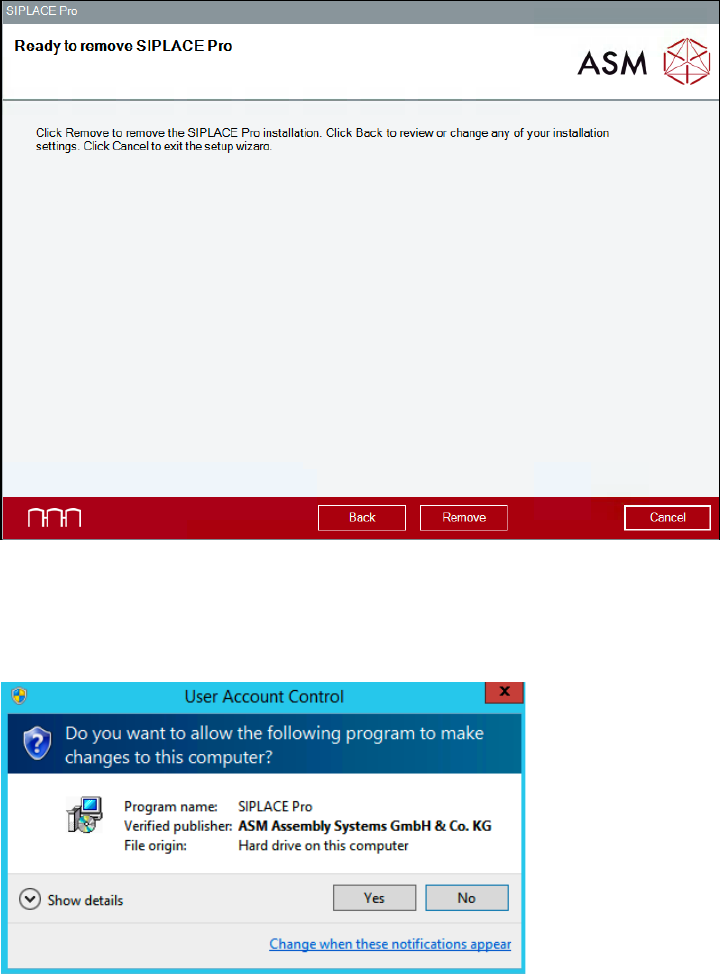 ► Click the Remove button to confirm uninstalling the SIPLACE Pro software.