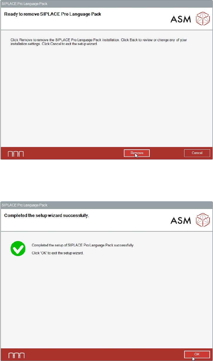 ► Click the Remove button to confirm uninstalling the SIPLACE Pro Language Pack software.